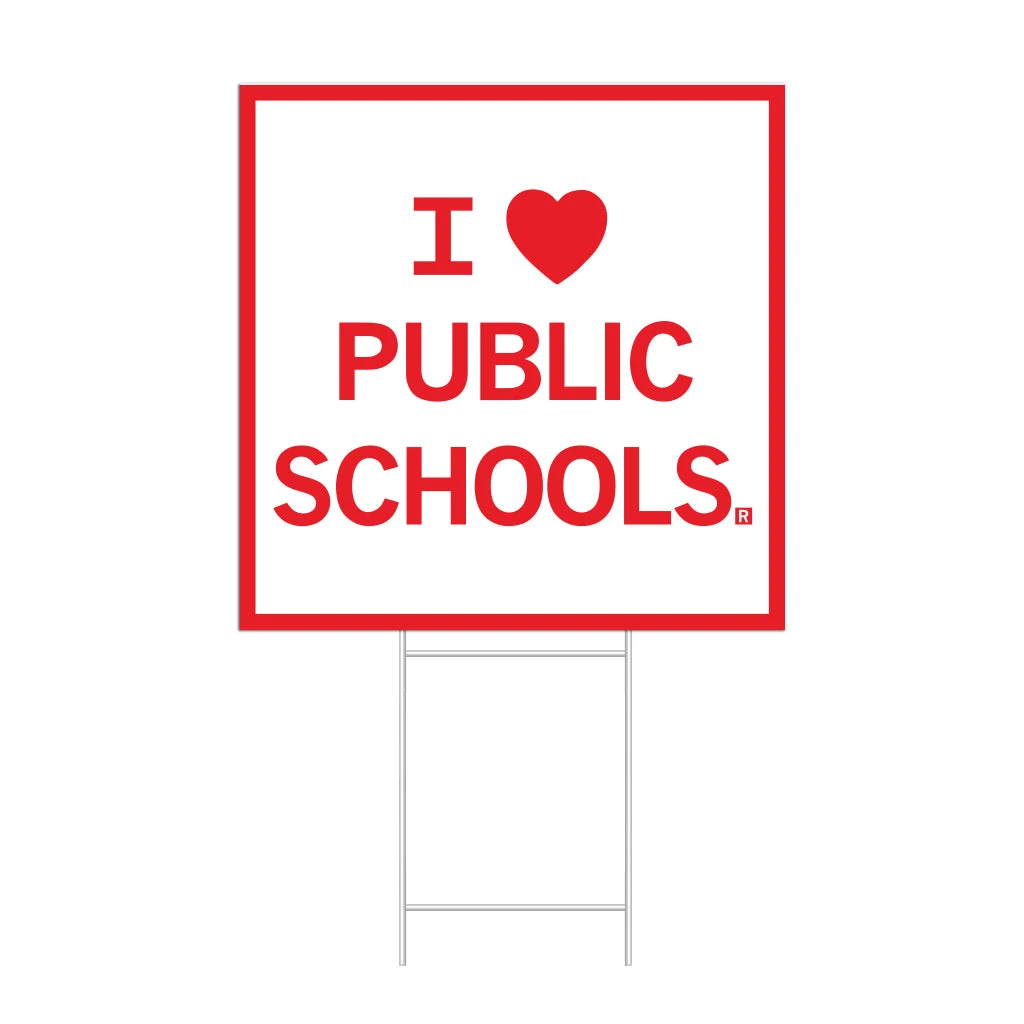 I Heart Public Schools. 12″ x 12″ Chloroplast Yard Sign with 10″ x 14″ Metal Stake. Designed by RAYGUN and made in Des Moines, IA.