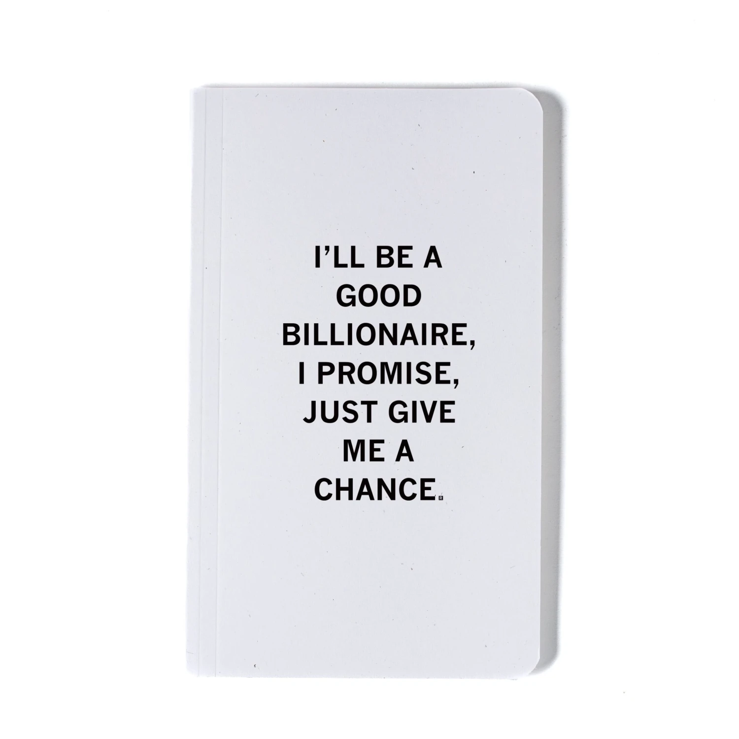 I’ll Be A Good Billionaire, I Promise, Just Give Me A Chance. Black Screen Print on unlined paper made in the USA, dimensions 5.5″ x 8.5″. Designed by RAYGUN and printed by Union Labor at RAYGUN. Assembled using union labor at Garner Printing in Des Moines, IA.