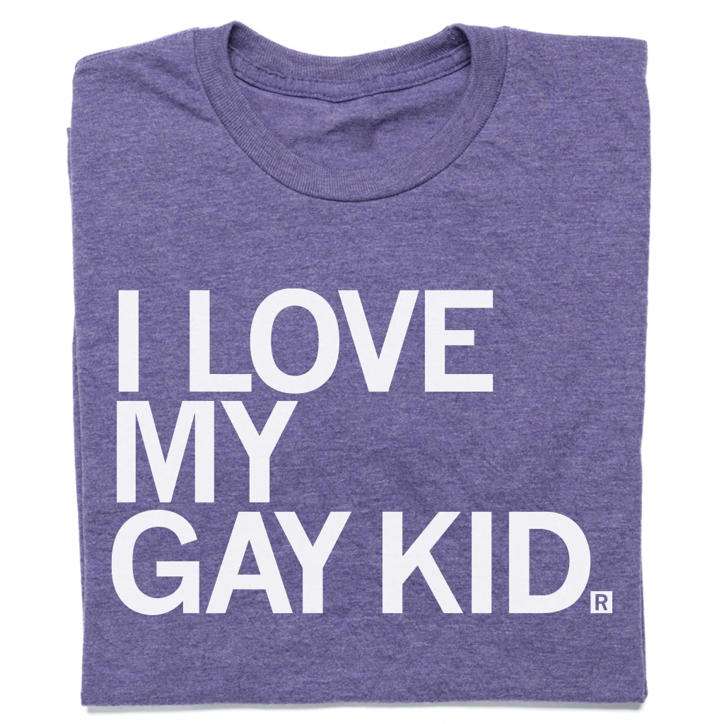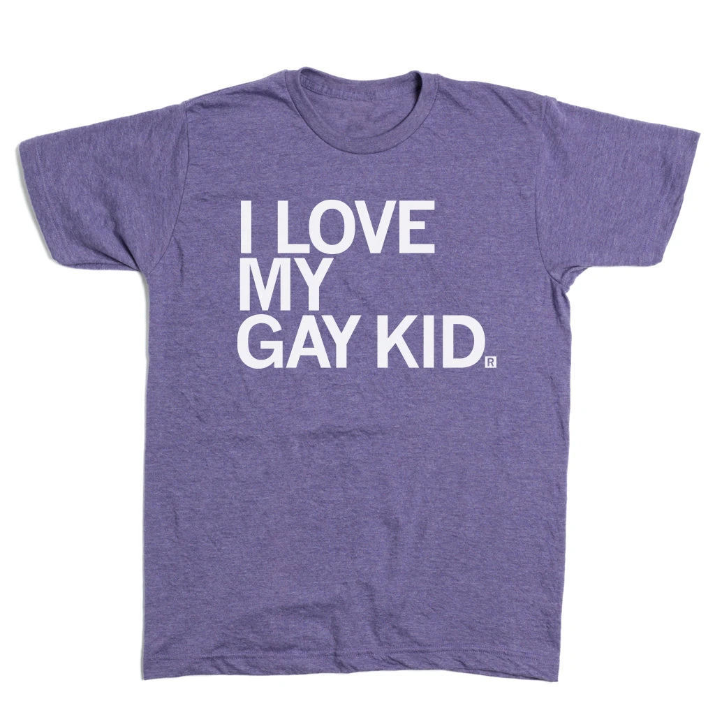 I Love My Gay Kid. A Portion of All RAYGUN Sales Raise Money For Organizations That We Support. White Screen Print on a Heather Purple T-shirt (50% Combed Ringspun Cotton / 50% Polyester). Cut and sewn sweatshop free. Designed and printed by Union Labor at RAYGUN.