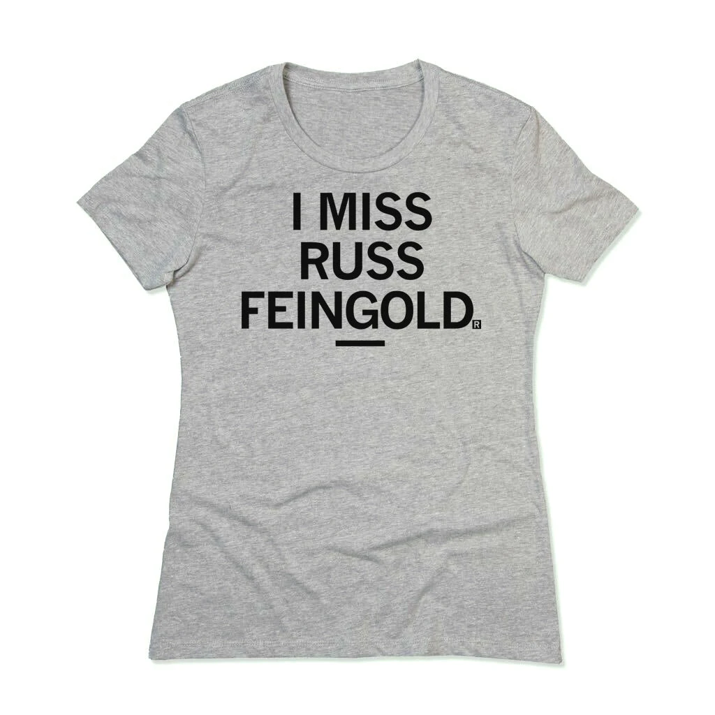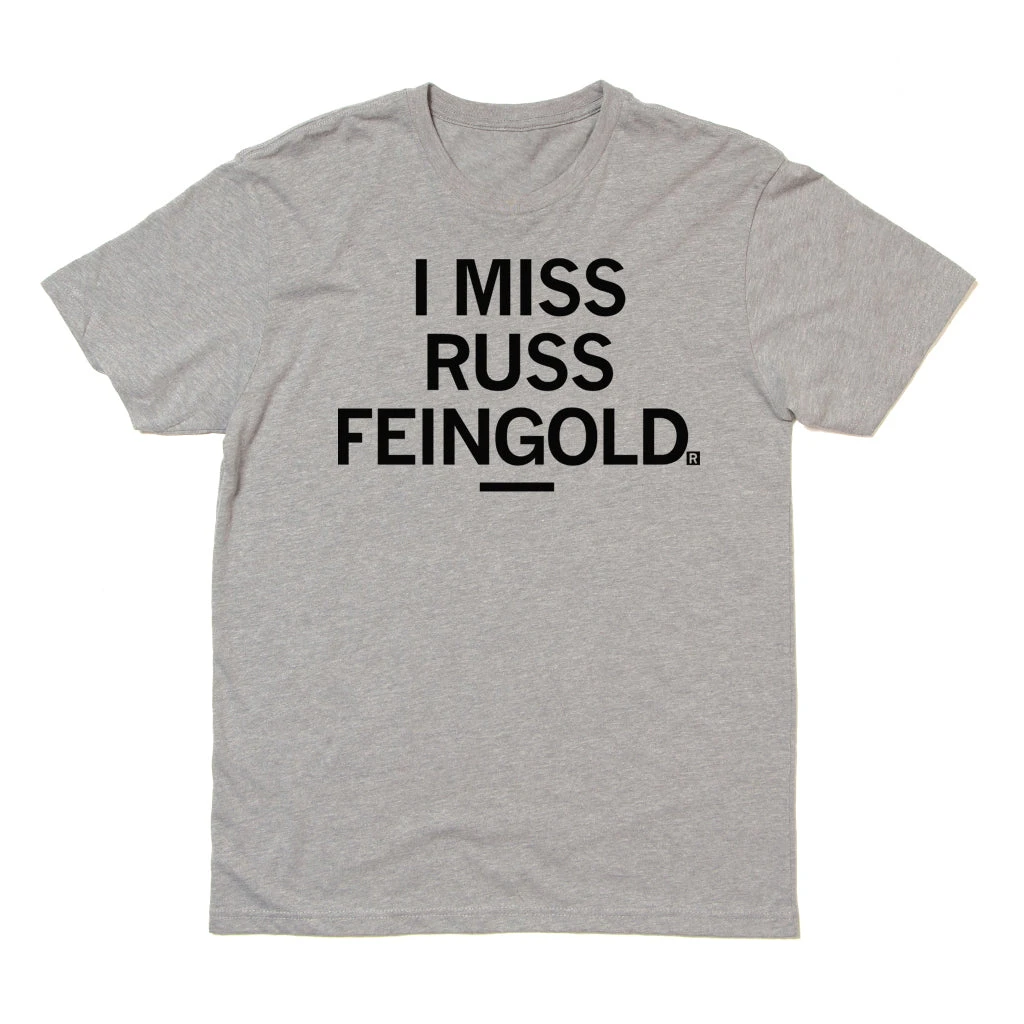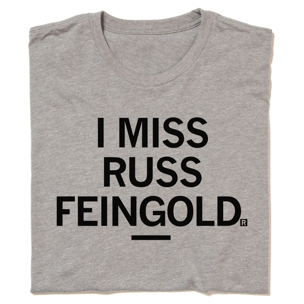 I Miss Russ Feingold. This Design Has Been Retired and is No Longer Available on Our Sales Floors But Can Be Ordered Here Online! Since All of Our Retired Designs Are Printed on Demand, Please Allow For a Couple Extra Days Before Shipping. A Portion of Sales Raise Money For IssueOne.org. Black Screen Print on a Heather Grey T-Shirt (35% Combed Ringspun Cotton / 65% Polyester). Cut and sewn sweatshop free. Designed and printed by Union Labor at RAYGUN.