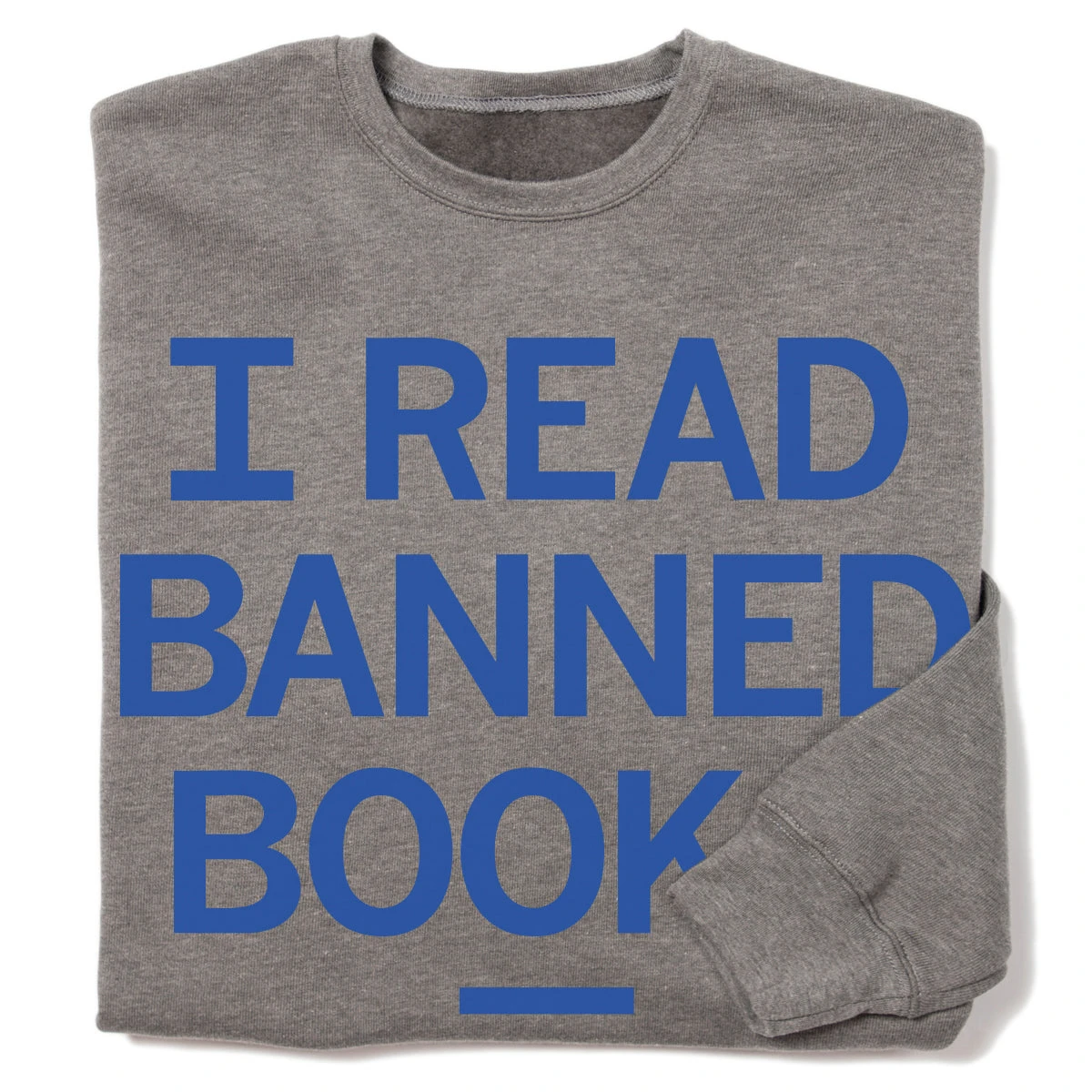 I Read Banned Books. Some proceeds from this shirt benefit the local ACLU Chapters, public schools, and public libraries. Mono Blue Screen Print on a Deep Heather Crew Sweatshirt (52% Combed Ringspun Cotton / 48% Polyester). Cut and sewn sweatshop free. Designed and printed by Union Labor at RAYGUN.