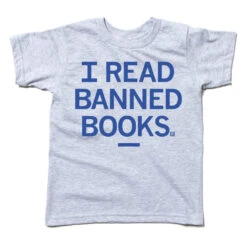 I Read Banned Books. Some proceeds from this shirt benefit the local ACLU Chapters, public schools, and public libraries. Mono Blue Screen Print on a Heather Grey T-shirt (90% Combed Ringspun Cotton / 10% Polyester). Cut and sewn sweatshop free. Designed and printed by Union Labor at RAYGUN.