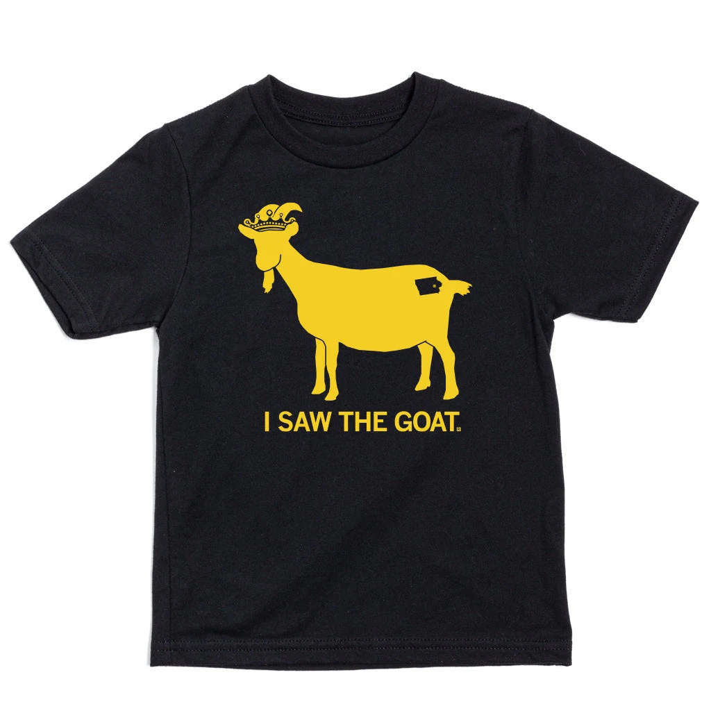 I Saw The Iowa GOAT. Gold Screen Print on a Black T-Shirt (100% Combed Ringspun Cotton). Cut and sewn sweatshop free. Designed and printed by Union Labor at RAYGUN.