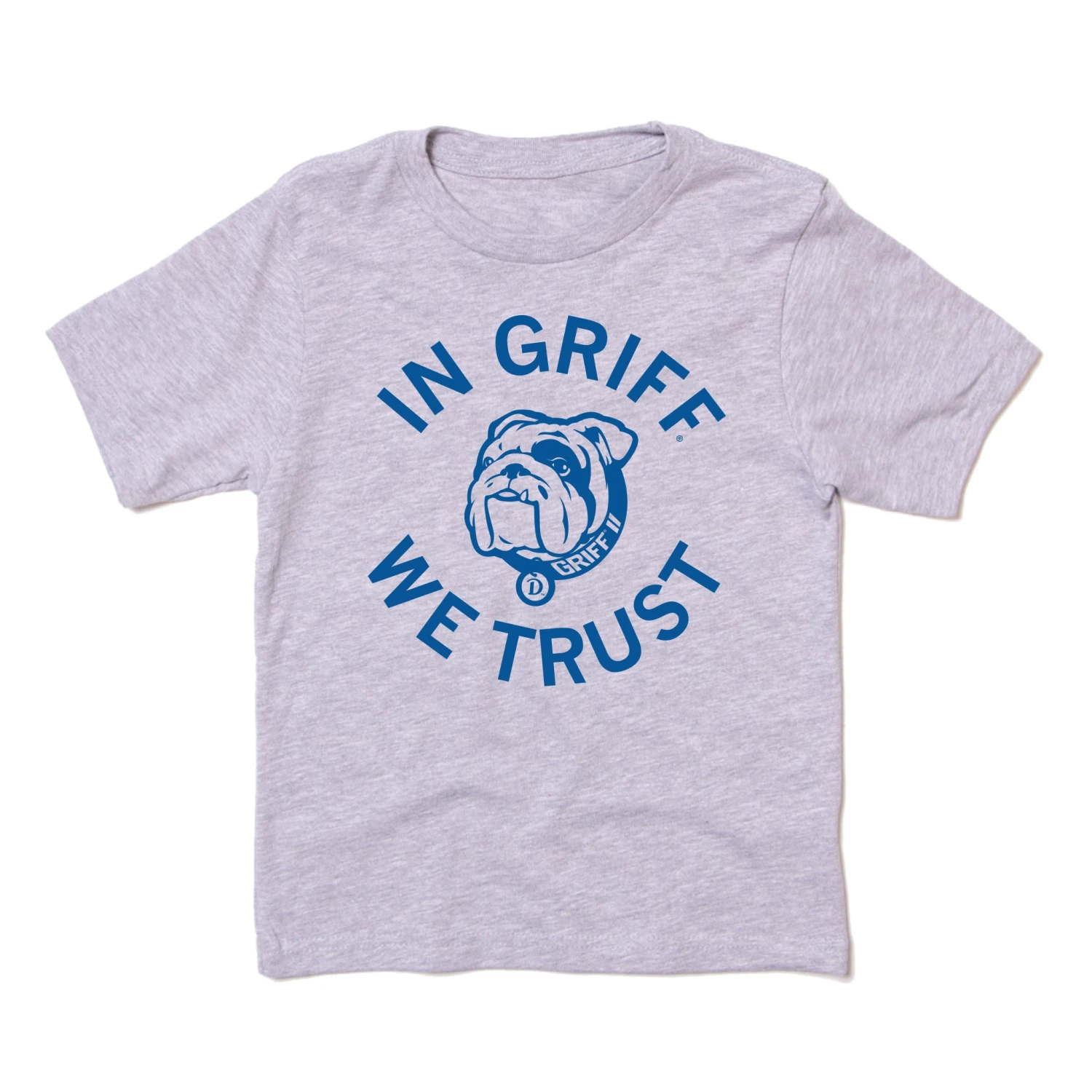 Drake University: In Griff We Trust. A Portion of All RAYGUN Sales Raise Money For Organizations That We Support. Royal Blue Screen Print on a Heather Grey Shirt (90% Cotton / 10% Polyester). Cut and sewn sweatshop free. Designed and printed by Union Labor at RAYGUN.
