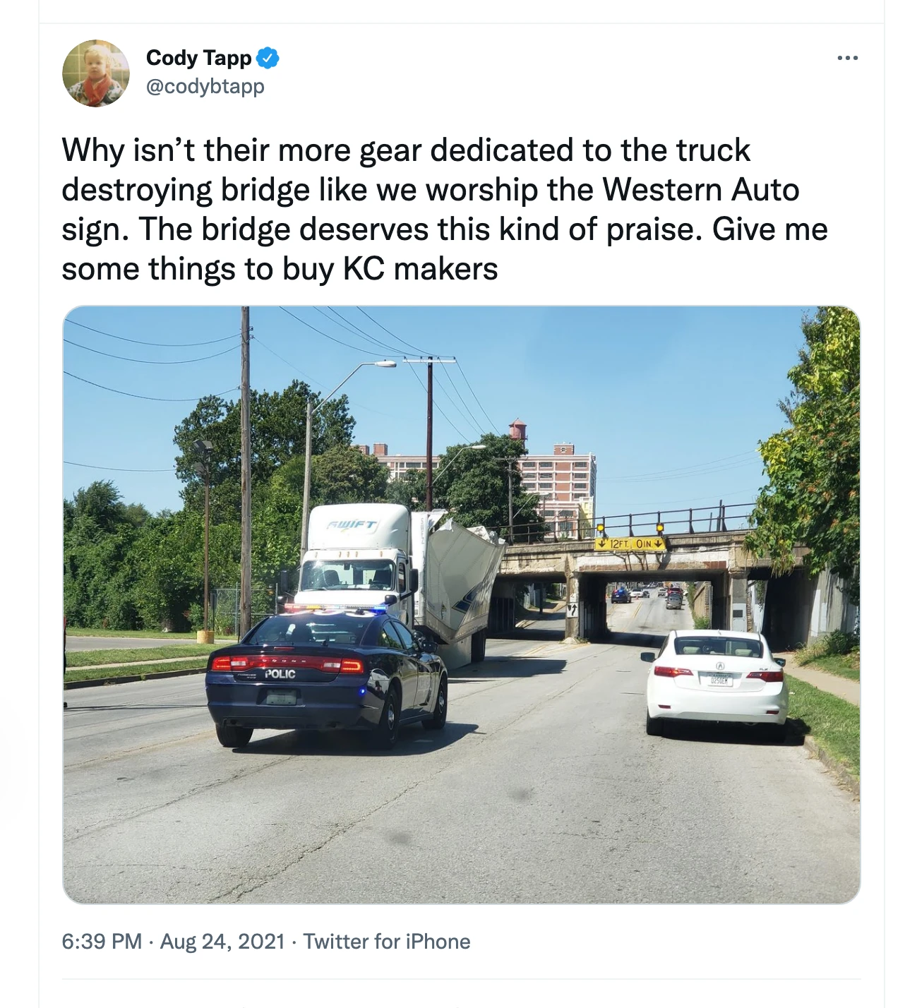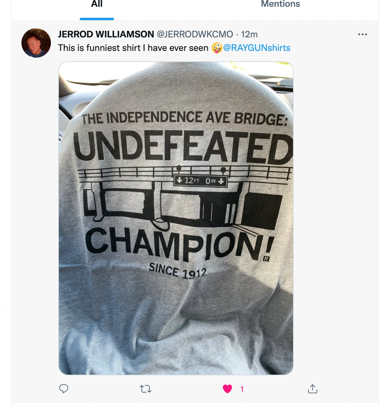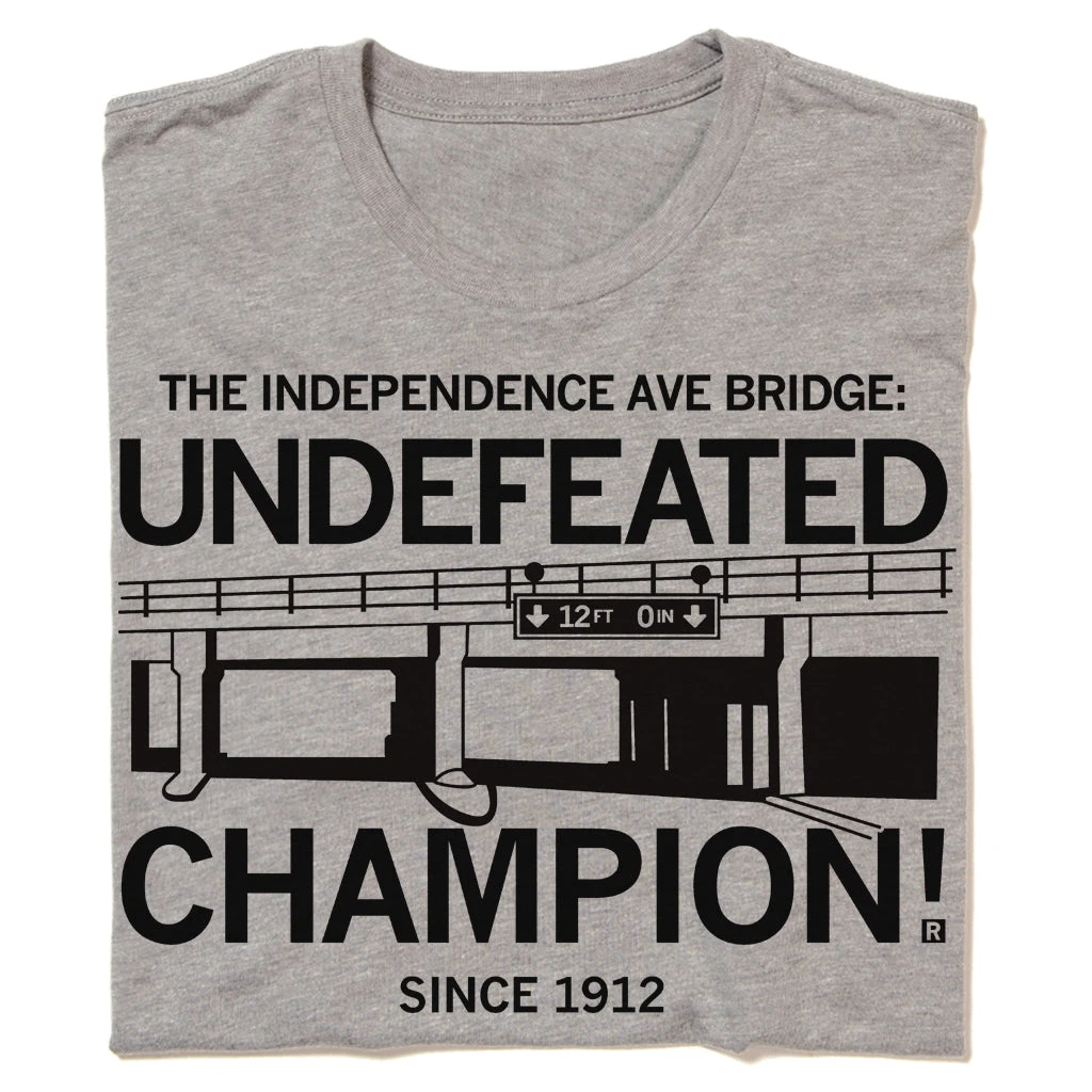 The Independence Ave Bridge: Undefeated Champion! Since 1912. This Design Has Been Retired and is No Longer Available on Our Sales Floors But Can Be Ordered Here Online! Since All of Our Retired Designs Are Printed on Demand, Please Allow For a Couple Extra Days Before Shipping. This shirt was inspired by a Twitter conversation, and proceeds will benefit the Kansas City Public Schools Foundation and Cars 4 Heroes! Black Screen Print on a Heather Grey T-Shirt (65% Polyester / 35% Combed Ringspun Cotton). Cut and sewn sweatshop free. Designed and printed by Union Labor at RAYGUN.