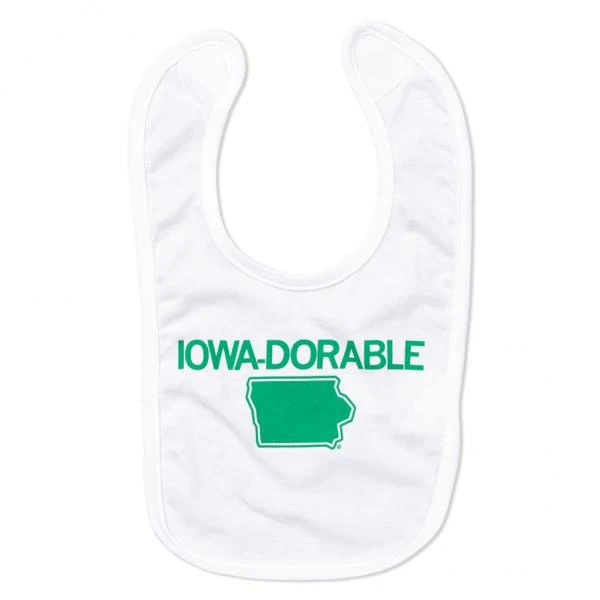 Iowa-Dorable Bib. Kelly Green Screen Print On A White Bib (100% Cotton). Cut and sewn sweatshop free. Designed and printed by Union Labor at RAYGUN.