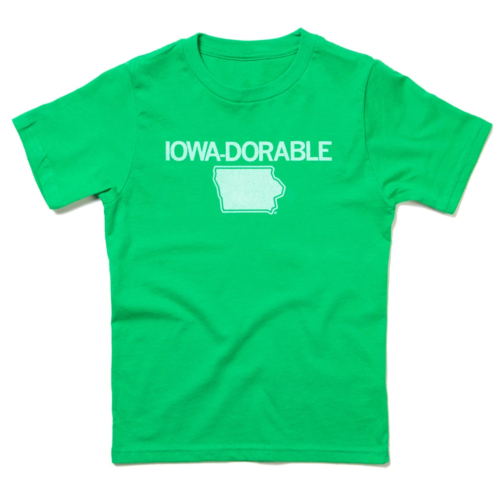 Iowa-Dorable. 2T & 4T sizes are a Tic Tac Green Screen Print on a Kelly Green T-shirt (100% Combed Ringspun Cotton) while 5T (YXS) and above are on a Heather Kelly Green T-shirt (60% Combed Ringspun Cotton / 40% Polyester). Cut and sewn sweatshop free. Designed and printed by Union Labor at RAYGUN.