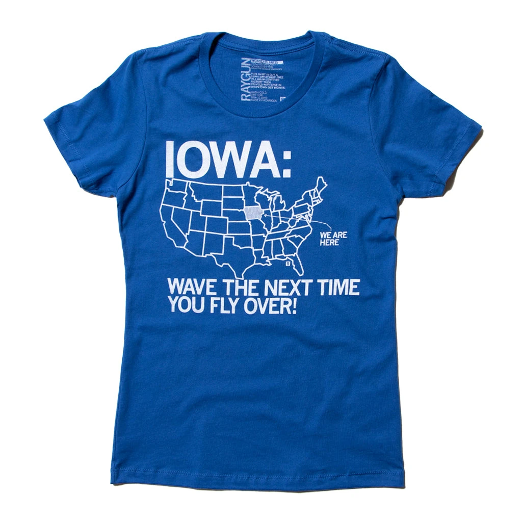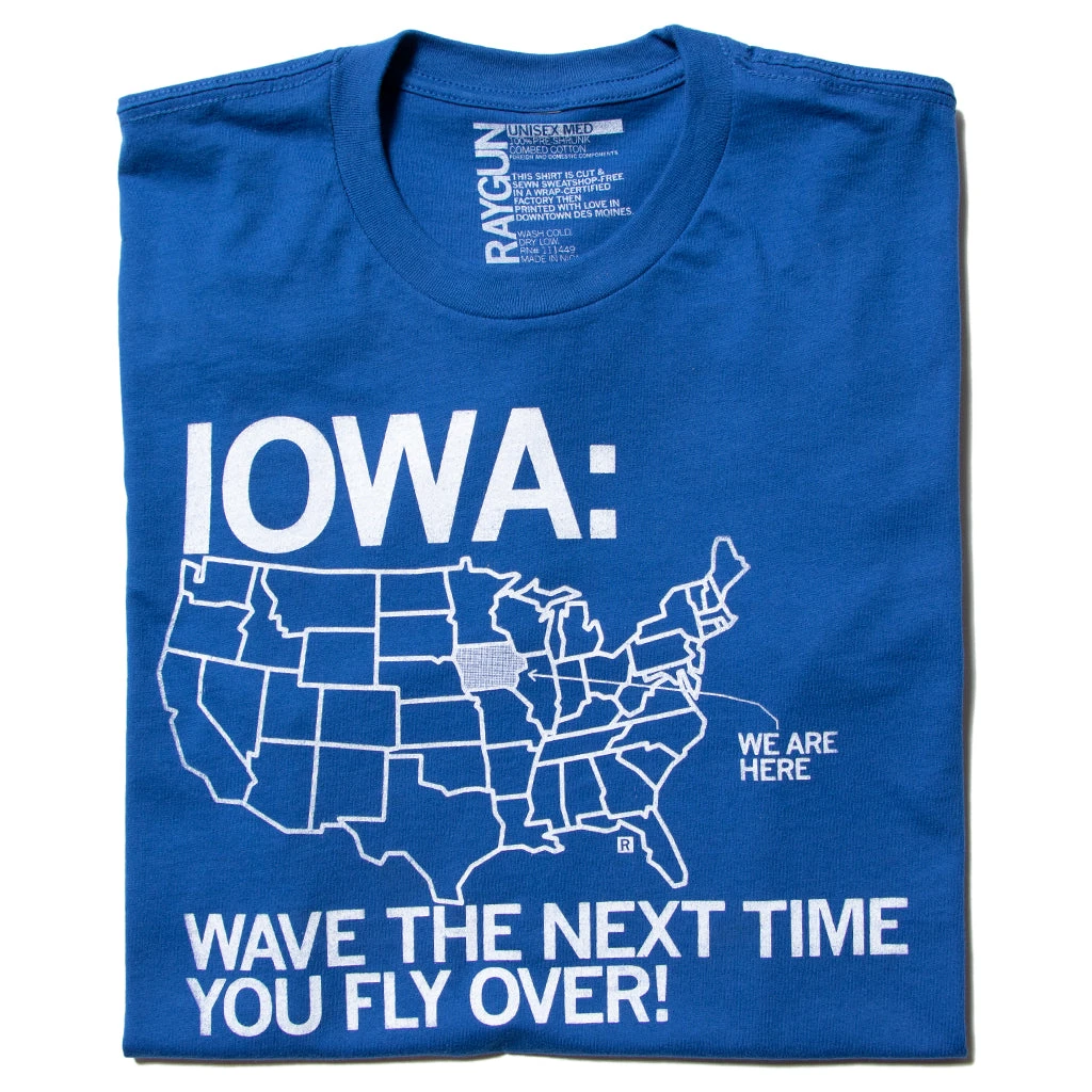 Iowa: Wave The Next Time You Fly Over! A Portion of All RAYGUN Sales Raise Money For Organizations That We Support. White Screen Print on Royal Blue T-shirt (100% Combed Ringspun Cotton). Cut and sewn sweatshop free. Designed and printed by Union Labor at RAYGUN.