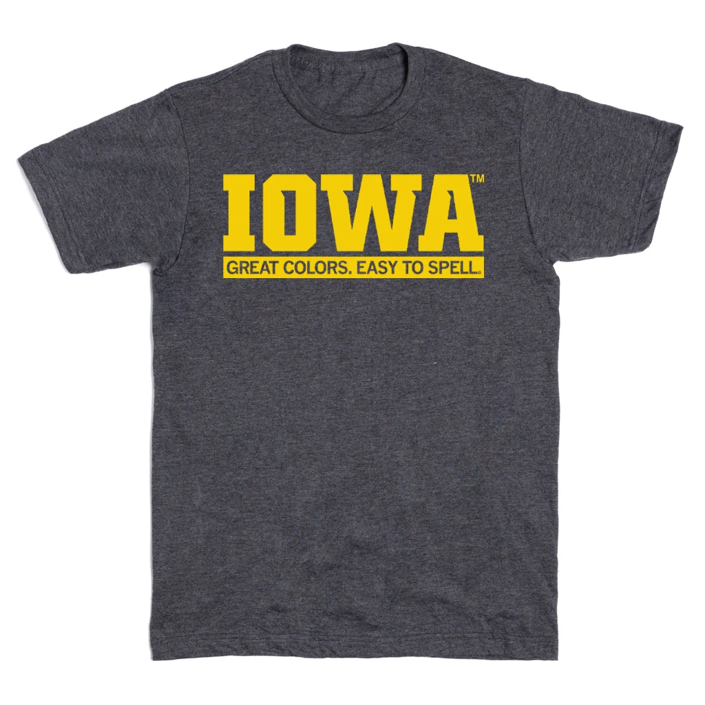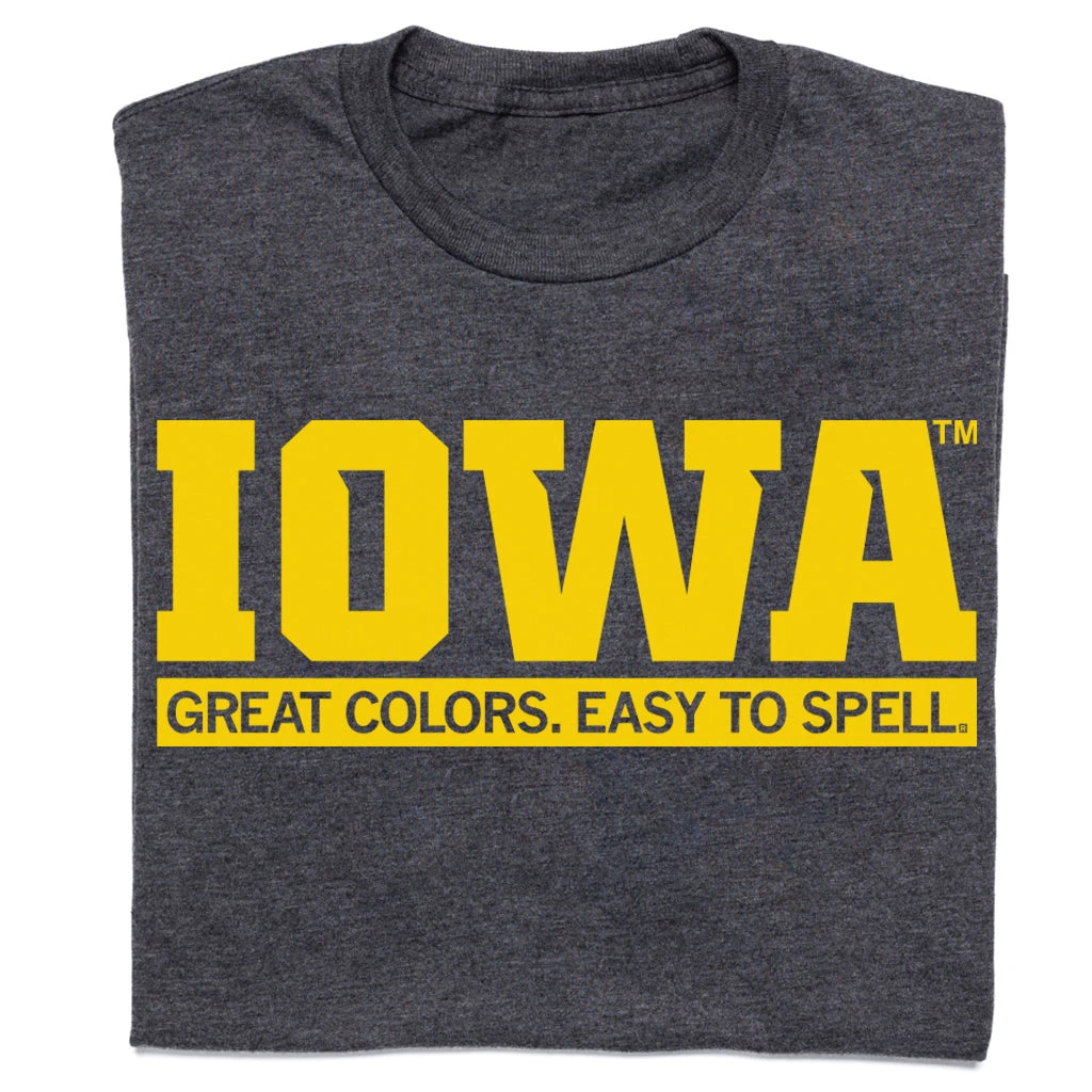 Iowa: Great Colors. Easy To Spell. Inspired by KF, officially licensed. A Portion of All RAYGUN Sales Raise Money For Organizations That We Support. Gold Screen Print on a Charcoal T-shirt (50% Combed Ringspun Cotton / 50% Polyester). Cut & sewn sweatshop free. Designed and Printed by Union Labor at RAYGUN!