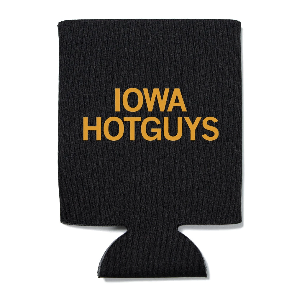 Iowa Hotguys. Gold plastisol ink print on black fade-resistant polyester covered scuba foam. Designed by RAYGUN. Imported and printed in the USA.
