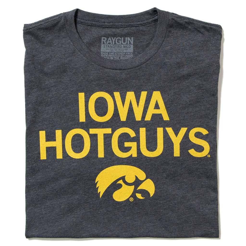 Iowa Hotguys. A Portion of All RAYGUN Sales Raise Money For Organizations That We Support. Gold Screen Print on a Charcoal T-shirt (50% Combed Ringspun Cotton / 50% Polyester) Cut & sewn sweatshop free. Designed and Printed by Union Labor at RAYGUN