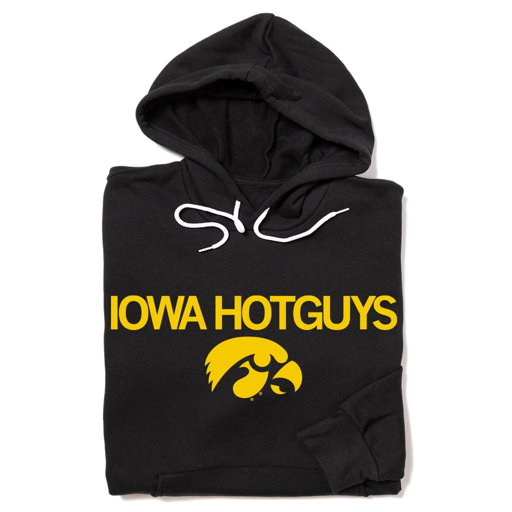 Iowa Hot Guys. A Portion of All RAYGUN Sales Raise Money For Organizations That We Support. Gold Screen Print on a Black Pullover Hoodie (55% Combed and Ringspun Cotton / 45% Polyester). Cut and sewn sweatshop free. Designed and printed by Union Labor at RAYGUN.