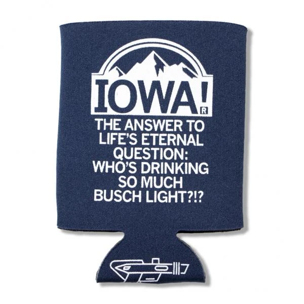 Iowa: The Answer To Life’s Eteral Question. Whose Drinking So Much Bush Light? White plastisol ink print on navy fade-resistant polyester covered scuba foam. Designed by RAYGUN. imported and printed in the USA.