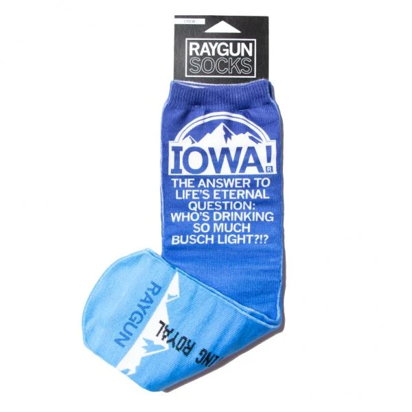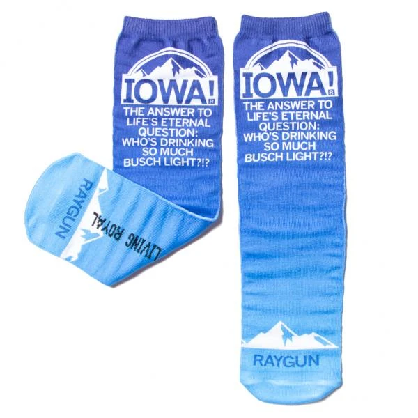 Iowa, The Answer To Life’s Eternal Question: Who’s Drinking So Much Light Beer? One size fits most. (100% polyester). Women’s shoe size 4-12, and men’s shoe size 6-13. Each sock is handmade and; due to the human condition; imperfections may occur. Manufactured by Living Royal in Chicago, IL Designed by RAYGUN.