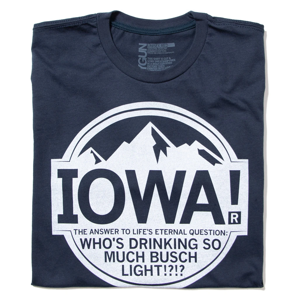 Iowa: The Answer To Life’s Eternal Question: Who’s Drinking So Much Light Beer? A Portion of All RAYGUN Sales Raise Money For Organizations That We Support. White Screen print on a Navy T-shirt (100% Combed Ringspun Cotton). Cut and sewn sweatshop free. Designed and printed by Union Labor at RAYGUN.