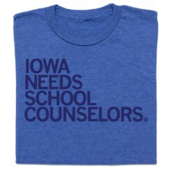 Iowa Needs School Counselors. This Design Has Been Retired and is No Longer Available on Our Sales Floors But Can Be Ordered Here Online! Since All of Our Retired Designs Are Printed on Demand, Please Allow For a Couple Extra Days Before Shipping. A Portion of All Raygun Sales Raise Money For Organizations That We Support. Light Navy Screen Print on a Heather Royal T-shirt (50% Combed Ringspun Cotton / 50% Polyester). Cut and sewn sweatshop free. Designed and printed by Union Labor at RAYGUN.