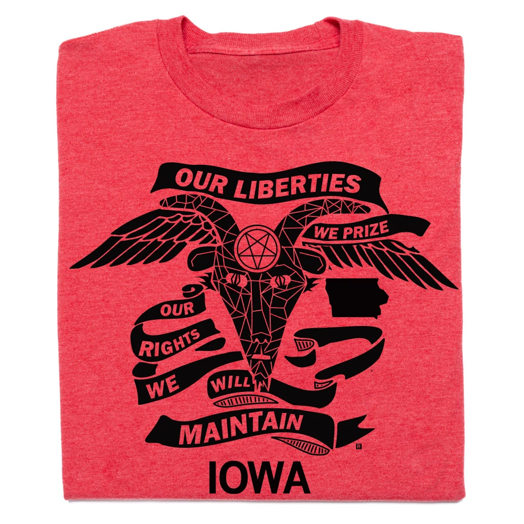 Iowa Satanic Temple: our liberties we prize, our rights we will maintain. Baphomet was beheaded! We’re raising money. Profits for this shirt go to Satanic Temple of Iowa. Black Screen Print on a Heather Red T-shirt (50% Combed Ringspun Cotton / 50% Polyester). Cut & sewn sweatshop free. Designed and Printed by Union Labor at RAYGUN.