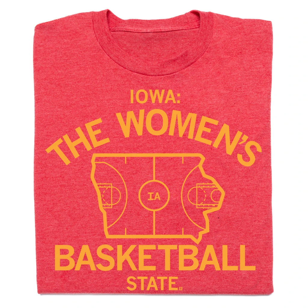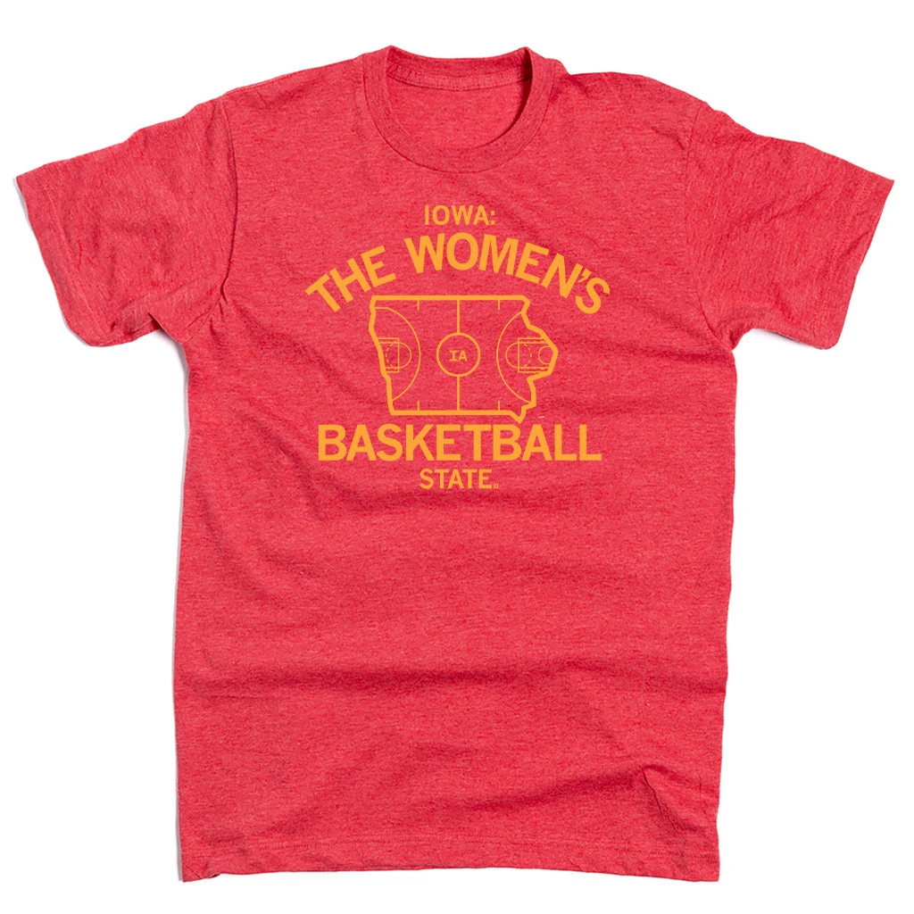 Iowa: The Women’s Basketball State. A Portion of All Raygun Sales Raise Money For Organizations That We Support. Gold Screen Print on a Heather Red T-shirt (50% Polyester / 50% Combed Ringspun Cotton). Cut and sewn sweatshop free. Designed and printed by Union Labor at RAYGUN.