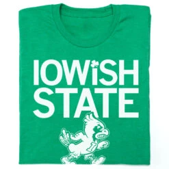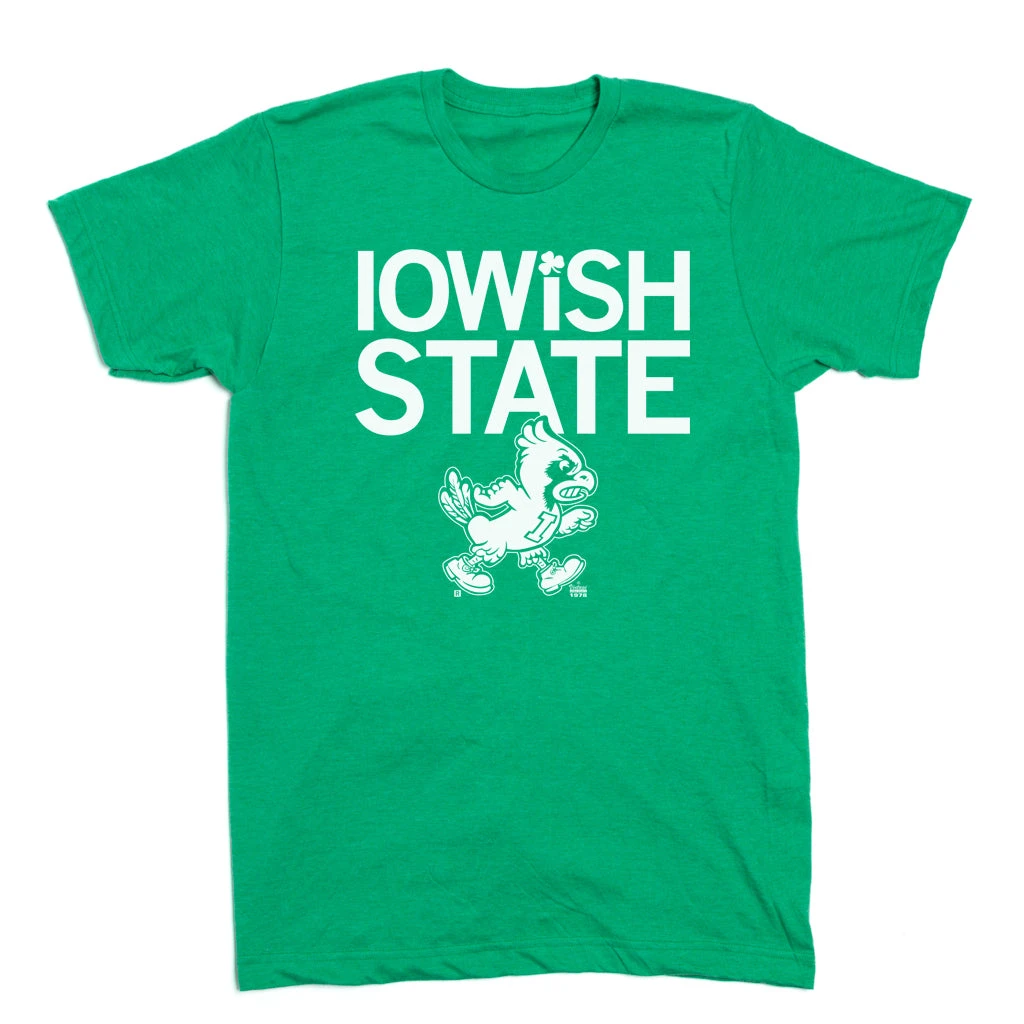 Iowish State. A Portion of All RAYGUN Sales Raise Money For Organizations That We Support. White screen print on Heather Kelly Green T-shirt (50% Combed Ringspun Cotton / 50% Polyester). Cut and sewn sweatshop free. Designed and printed by Union Labor at RAYGUN.