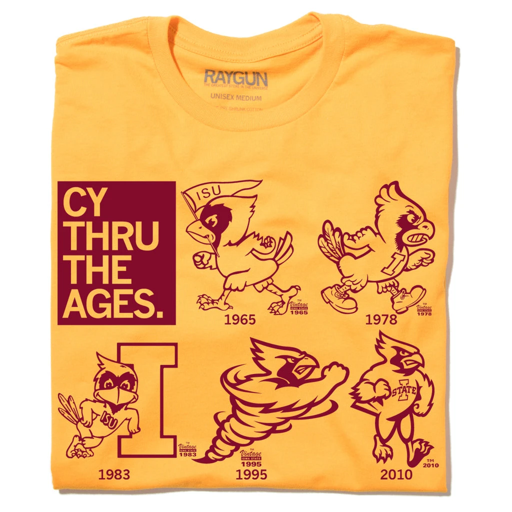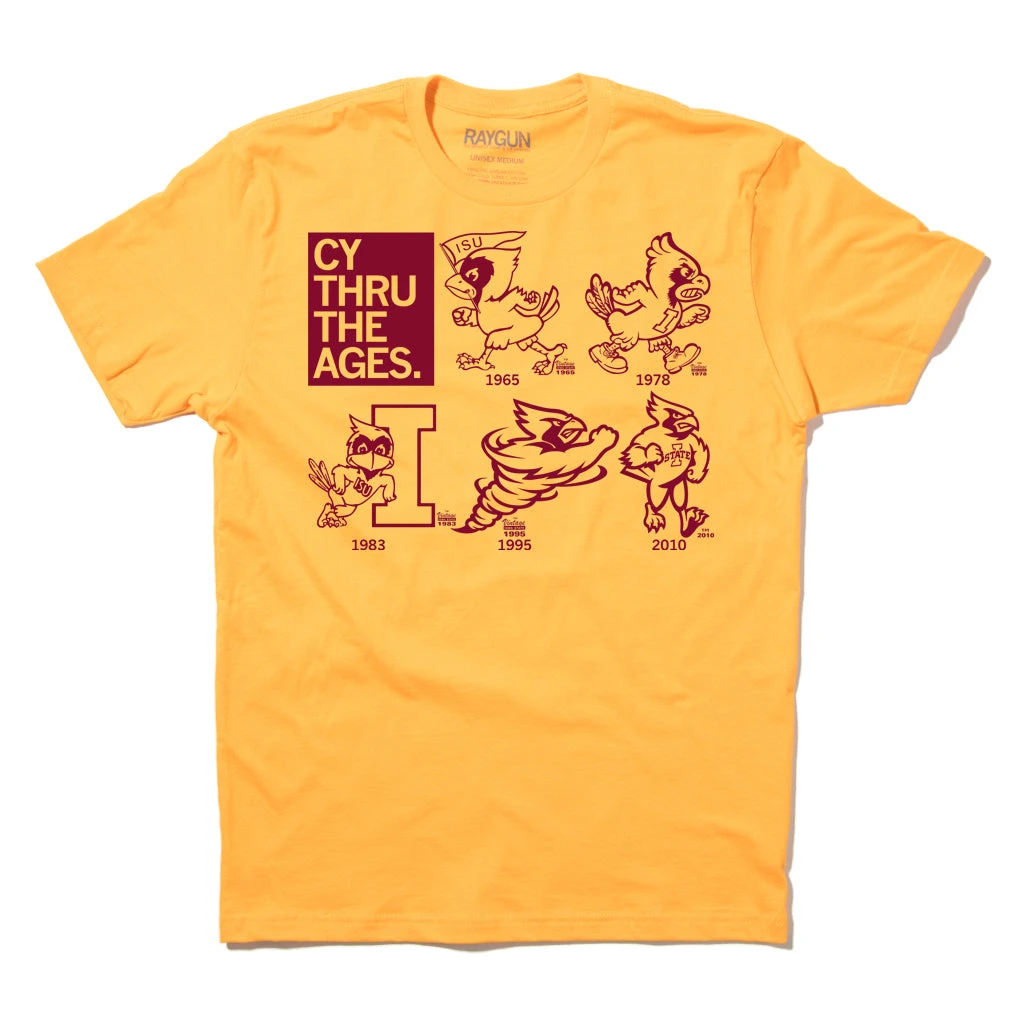 The Evolution of Cy Through the Ages. A Portion of All RAYGUN Sales Raise Money For Organizations That We Support. Cardinal Screen Print on a Gold T-shirt (100% Combed Ringspun Cotton) Cut & sewn sweatshop free. Designed and Printed by Union Labor at RAYGUN