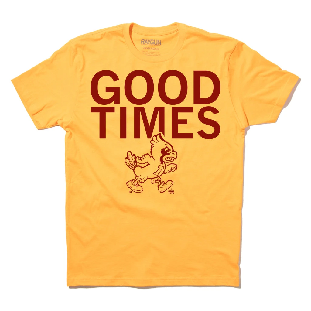So Good, So Good. A Portion of All RAYGUN Sales Raise Money For Organizations That We Support. Cardinal Screen Print on a Gold T-shirt (100% Combed Ringspun Cotton) Cut & sewn sweatshop free. Designed and Printed by Union Labor at RAYGUN