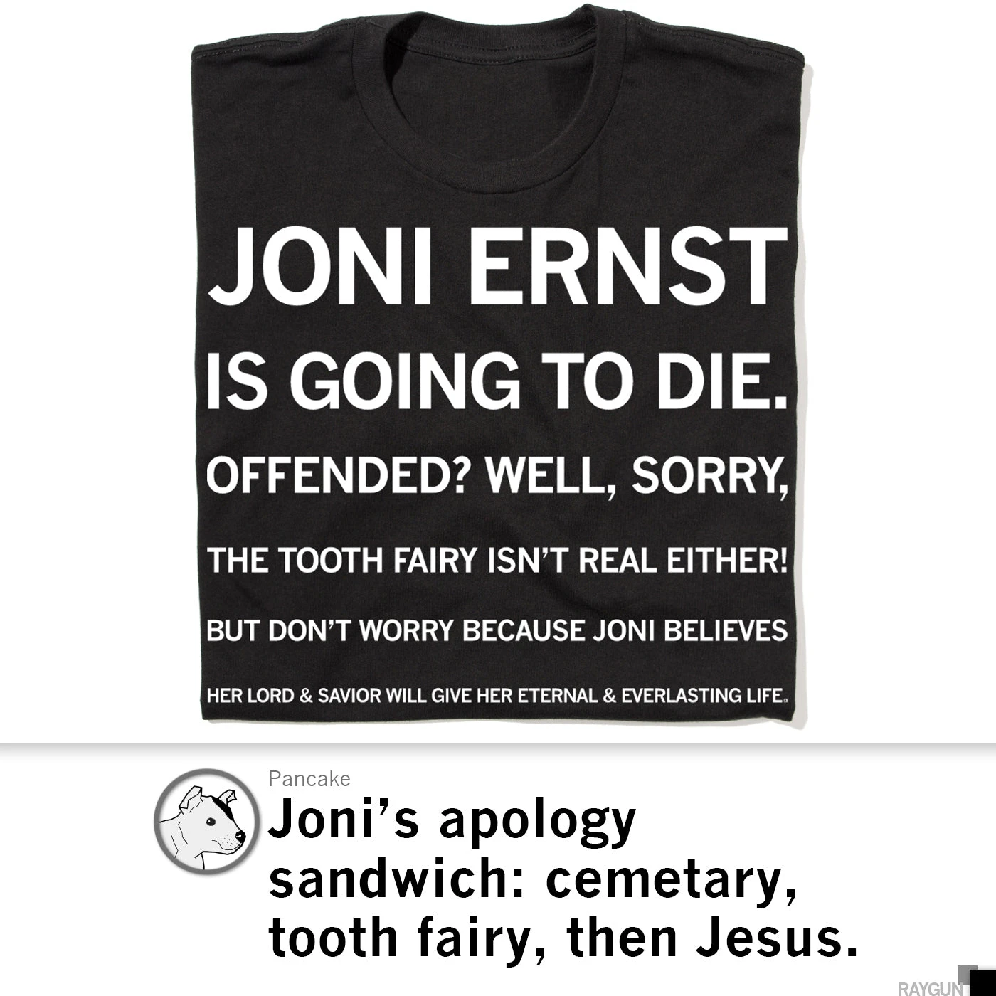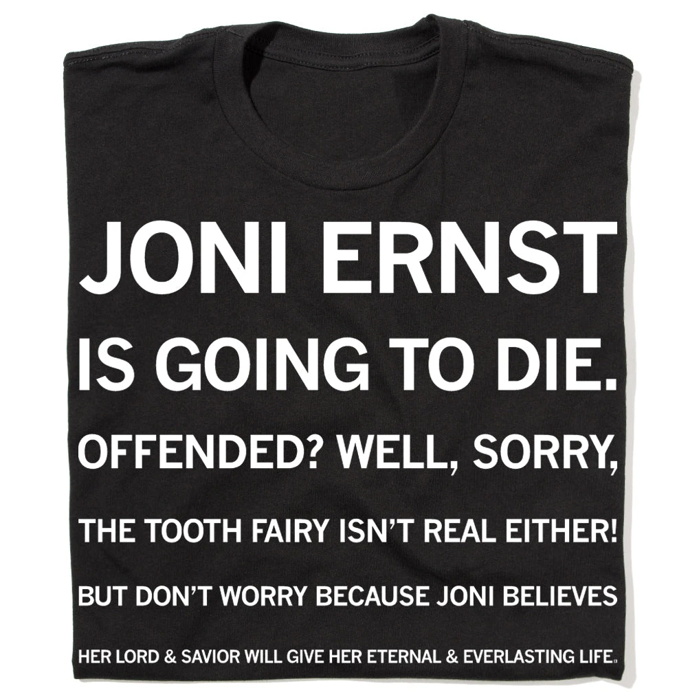 “We all are going to die” and that includes Joni Ernst. Offended? Well, sorry, the Tooth Fairy isn’t real either! But don’t worry because Joni believes her Lord & Savior will give her eternal & everlasting life even if she has blood on her hands. A Portion of All RAYGUN Sales Raise Money For Organizations That We Support. White Screen Print on a Black T-shirt (100% Combed Ringspun Cotton). Cut & sewn sweatshop free. Designed and Printed by Union Labor at RAYGUN.