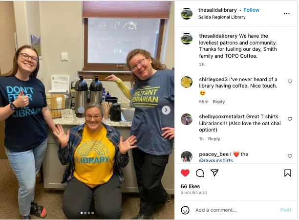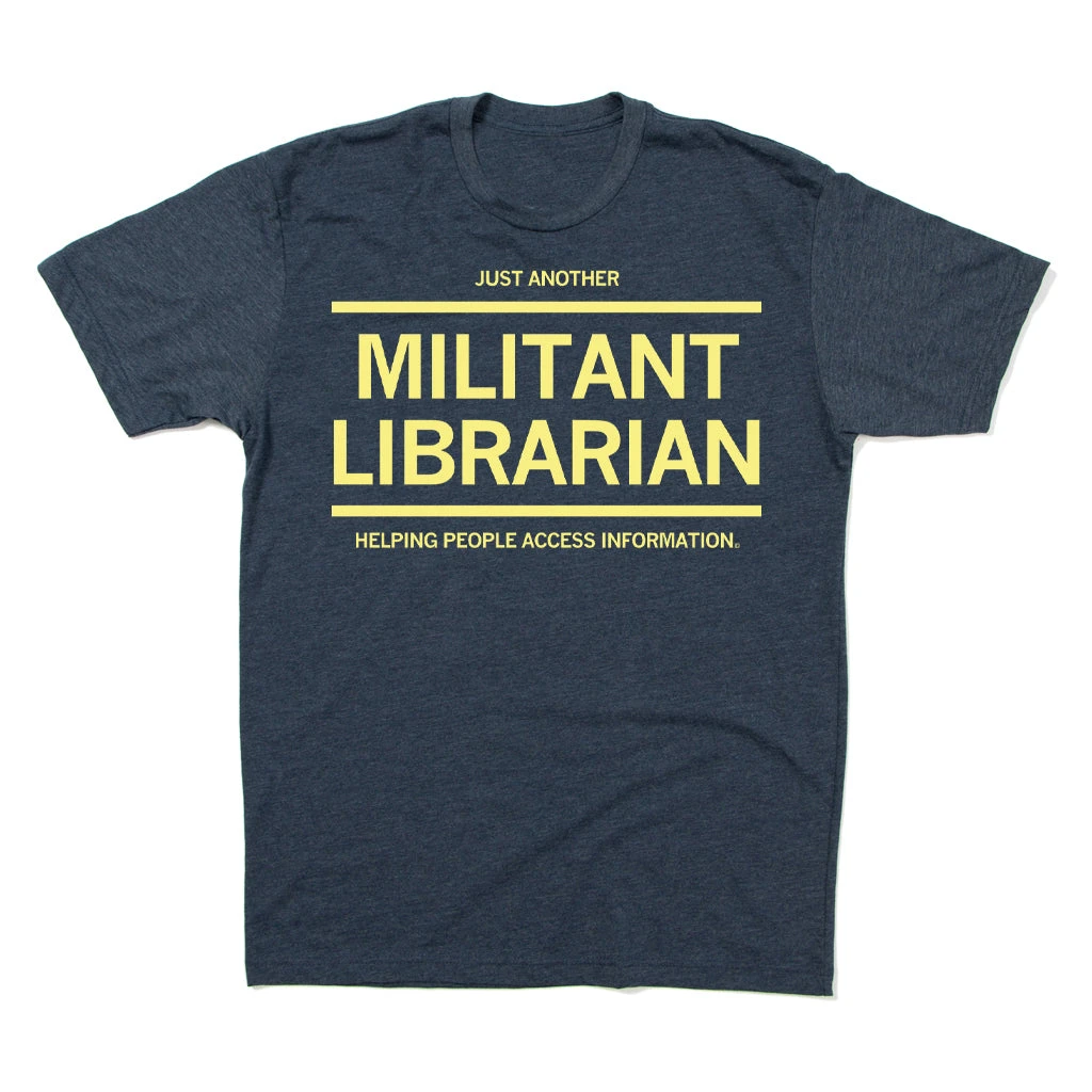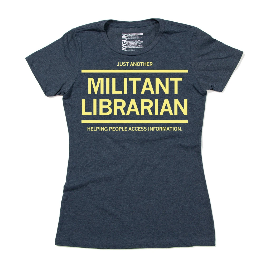 Just Another Militant Librarian Helping People Access Information. A Portion of All RAYGUN Sales Raise Money For Organizations That We Support. Primrose Screen Print on a Heather Denim T-shirt (50% Combed Ringspun Cotton / 50% Polyester). Cut and sewn sweatshop free. Designed and printed by Union Labor at RAYGUN.