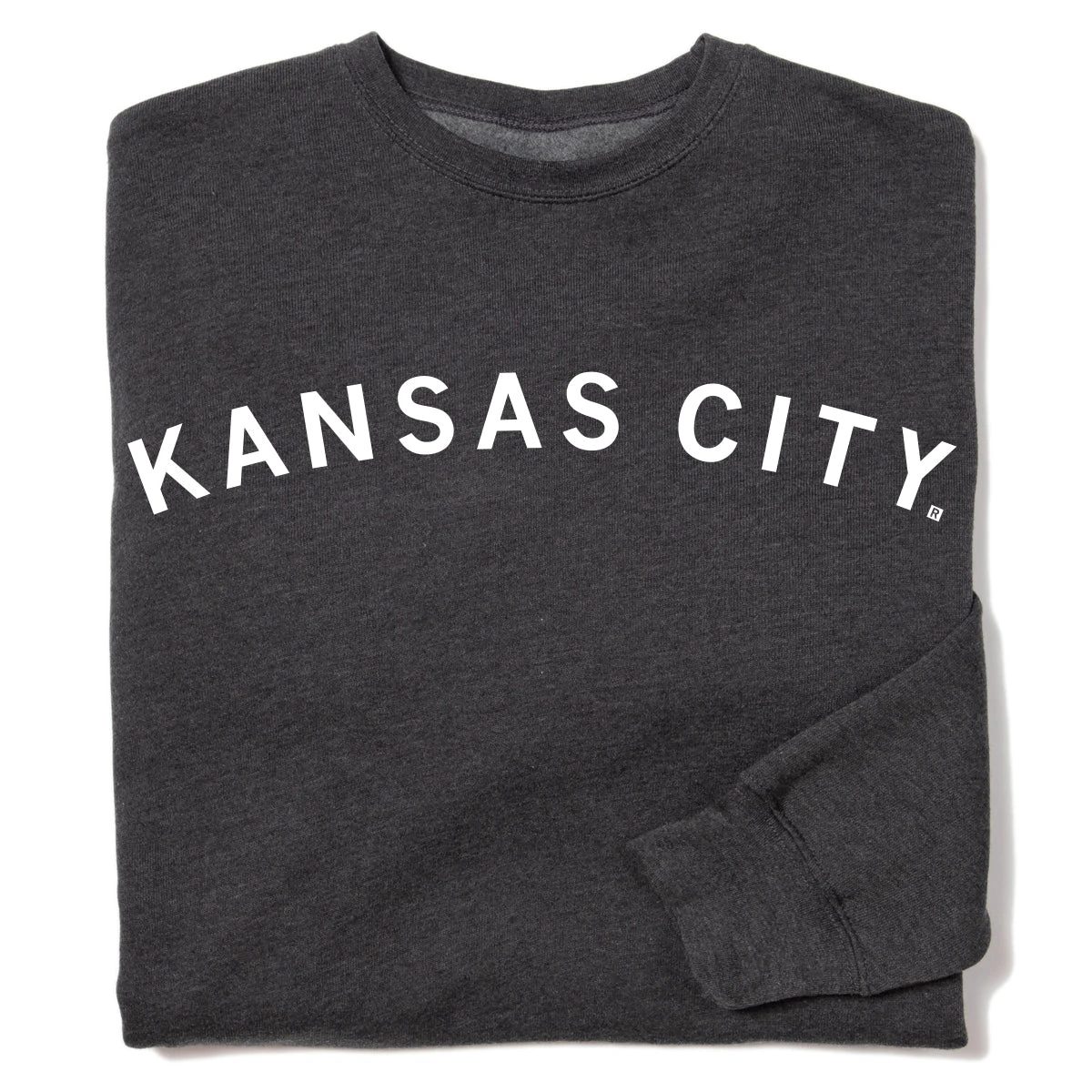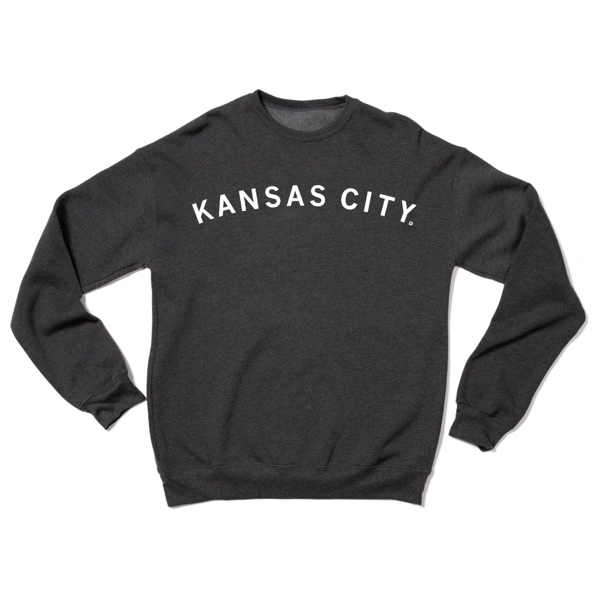 Kansas City, Missouri. A Portion of All RAYGUN Sales Raise Money For Organizations That We Support. White Screen Print on a Charcoal Heather Crew Sweatshirt (80% Combed Ringspun Cotton / 20% Polyester). Cut and sewn sweatshop free. Designed and printed by Union Labor at RAYGUN.