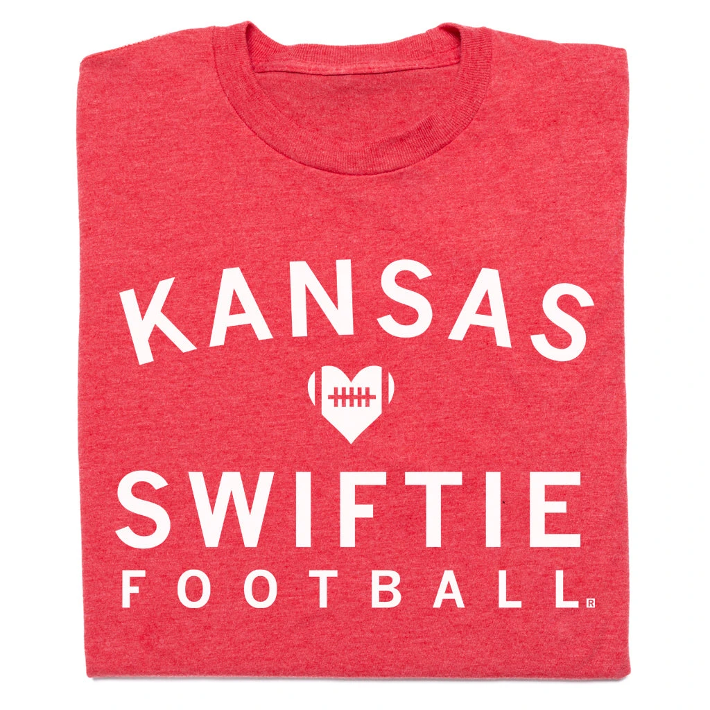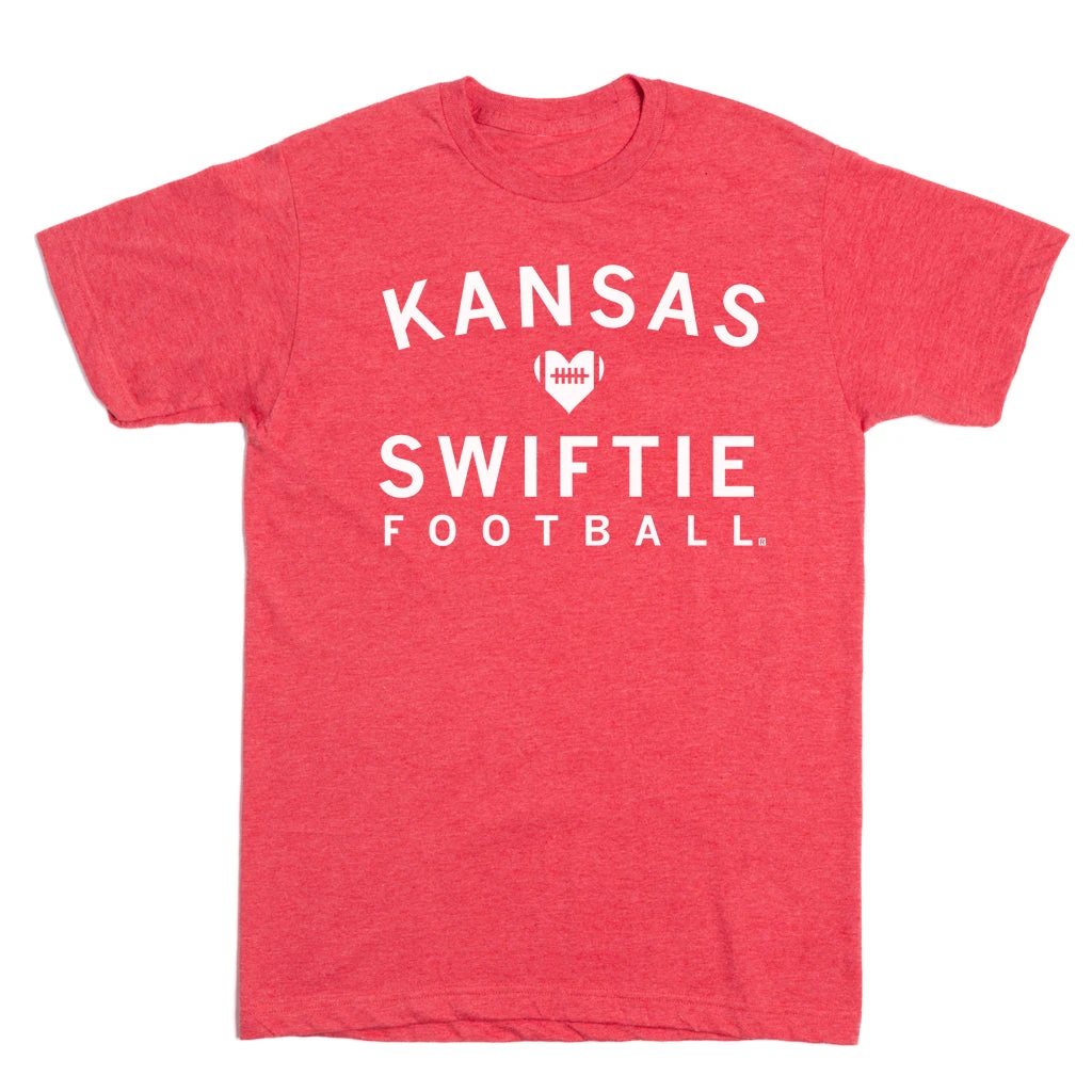 Kansas Swiftie Football. A Portion of All RAYGUN Sales Raise Money For Organizations That We Support. White Screen Print on a Heather Red T-shirt (50% Combed Ringspun Cotton / 50% Polyester). Cut & sewn sweatshop free. Designed and Printed by Union Labor at RAYGUN.
