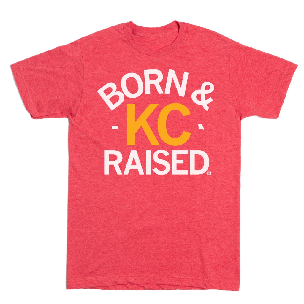 Kansas City Born and Raised. A Portion of All RAYGUN Sales Raise Money For Organizations That We Support. Gold & White Screen Print on a Heather Red T-Shirt (50% Polyester / 50% Combed Ringspun Cotton). Cut & sewn sweatshop free. Designed and Printed by Union Labor at RAYGUN.