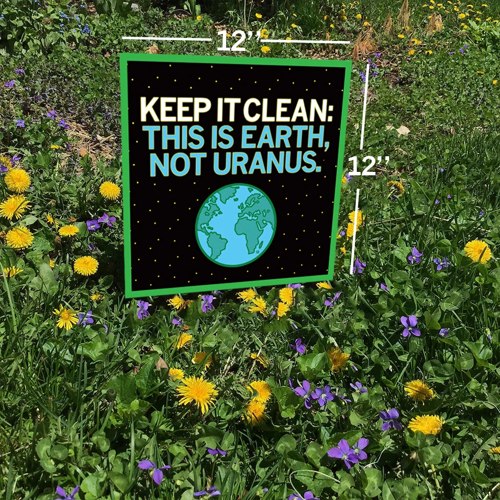 Keep It Clean: This Is The Earth, Not Uranus. 12″ x 12″ Chloroplast Yard Sign with 10″ x 14″ Metal Stake. Designed by RAYGUN and made in Des Moines, IA.