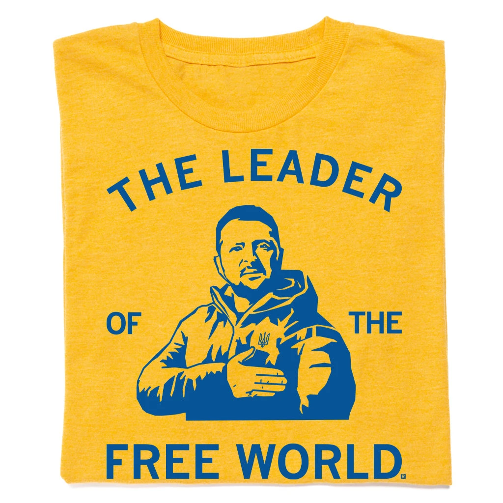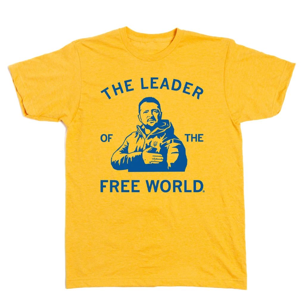 Volodymyr Zelenskyy: leader of the free world. A Portion of All RAYGUN Sales Raise Money For Organizations That We Support. Royal Blue Screen Print on a Heather Mellow Yellow T-shirt (50% Combed Ringspun Cotton / 50% Polyester). Cut and sewn sweatshop free. Designed and printed by Union Labor at RAYGUN.