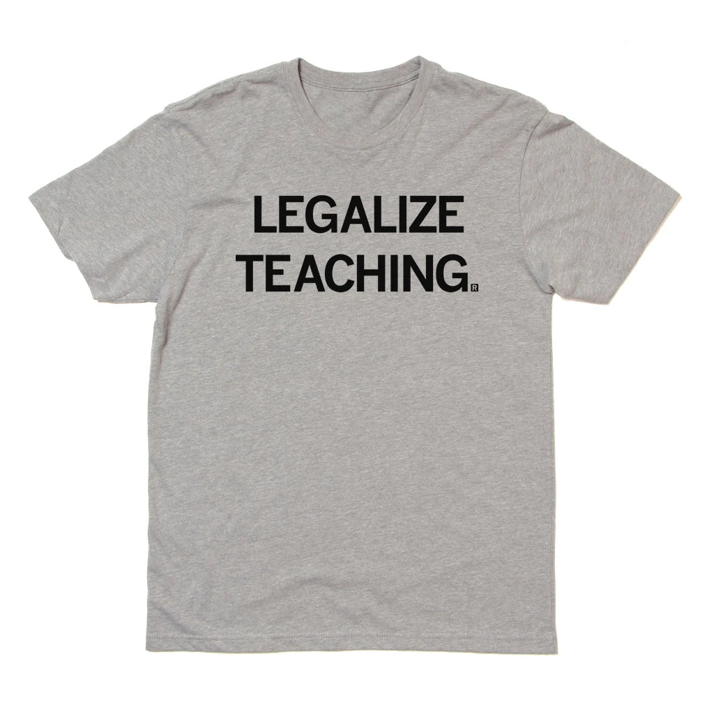 Legalize Teaching. RAYGUN has long supported public education, and sales of this shirt will help fund our continuing projects in the public school systems in the Des Moines, Iowa City, Cedar Rapids, Cedar Falls, Chicago, Omaha and Kansas City areas. Black Screen Print on a Heather Grey T-shirt (65% Polyester / 35% Combed Ringspun Cotton). Cut and sewn sweatshop free. Designed and printed by Union Labor at RAYGUN.