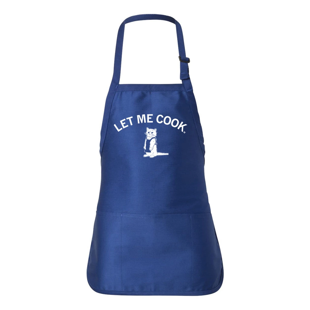 Let Me Cook. White Screen Print on a Royal Blue Full-Length Apron with Pouch (55% Cotton / 45% Polyester). Adjustable Neck Strap with Buckle. Waist Side Ties. Designed and printed by Union Labor at RAYGUN!