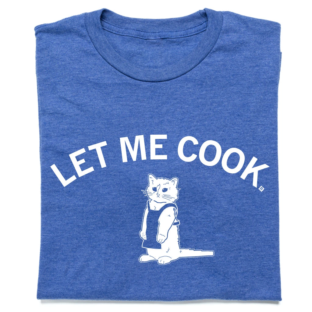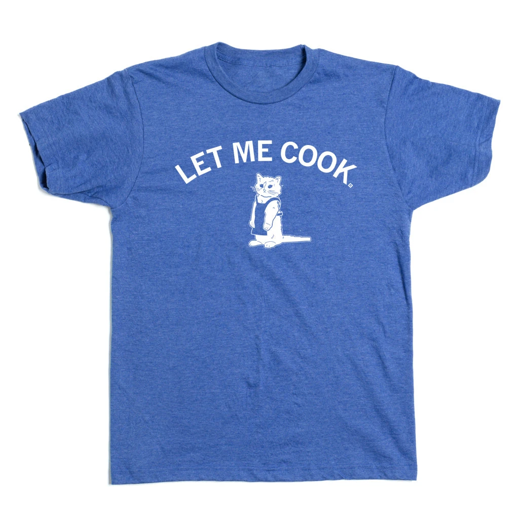 Let Me Cook. A Portion of All RAYGUN Sales Raise Money For Organizations That We Support. White Screen Print on a Heather Royal T-shirt (50% Combed Ringspun Cotton / 50% Polyester). Cut & sewn sweatshop free. Designed and Printed by Union Labor at RAYGUN.