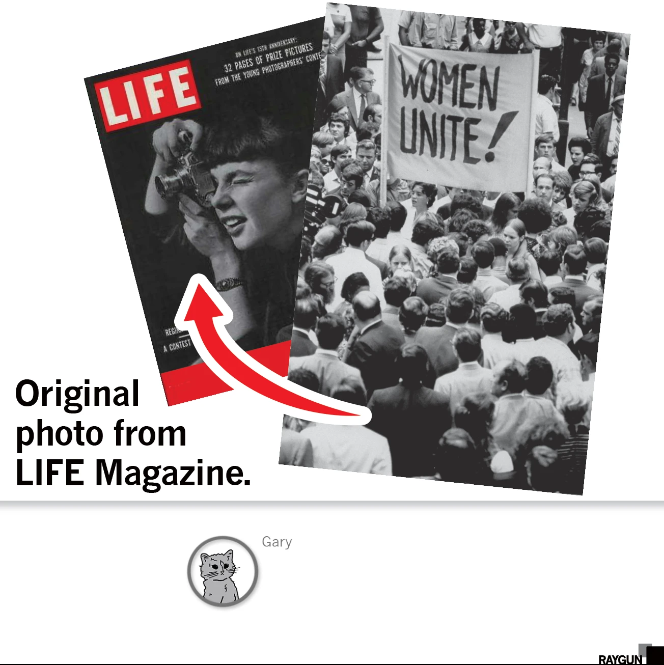 Women Unite! This product is part of our exclusive collaboration with the LIFE Magazine photo library. A Portion of All RAYGUN Sales Raise Money For Organizations That We Support. Brite Red & Black Screen Print on a White T-shirt (100% Combed Ringspun Cotton). Cut & sewn sweatshop free. Designed and Printed by Union Labor at RAYGUN.