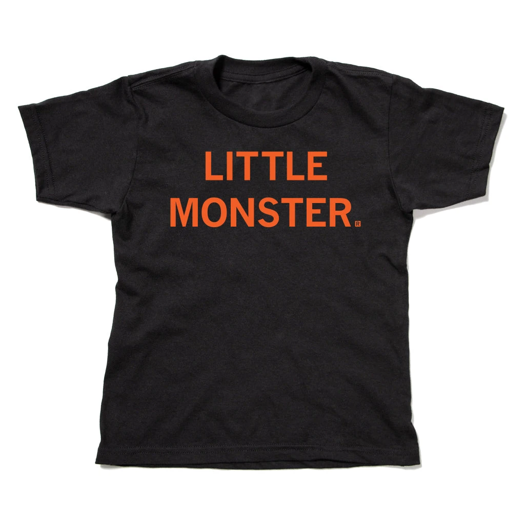 Little Monster. A Portion of All RAYGUN Sales Raise Money For Organizations That We Support. Orange Screen Print on a Black T-Shirt (100% Combed Ringspun Cotton). Cut and sewn sweatshop free. Designed and printed by Union Labor at RAYGUN.