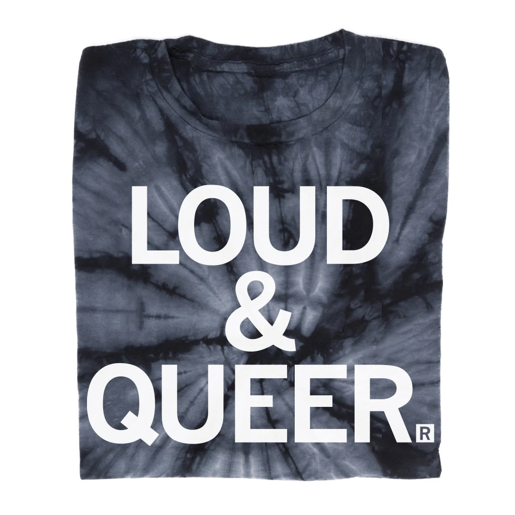 Loud & Queer. A Portion of All RAYGUN Sales Raise Money For Organizations That We Support. White Screen Print on a Tie-Dyed T-shirt (100% Combed Ringspun Cotton). Cut & sewn sweatshop free. Designed and Printed by Union Labor at RAYGUN.
