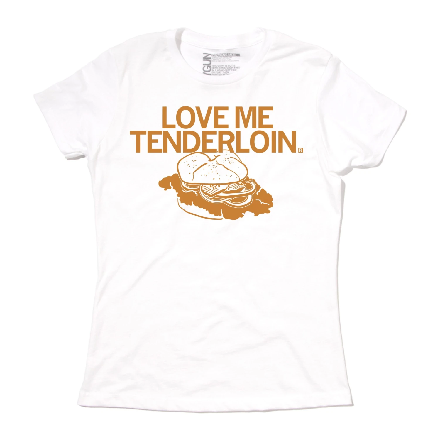 Love Me Tenderloin. A Portion of All Raygun Sales Raise Money For Organizations That We Support. Light Brown Screen Print on a White T-shirt (100% Combed Ringspun Cotton). Cut and sewn sweatshop free. Designed and printed by Union Labor at RAYGUN.