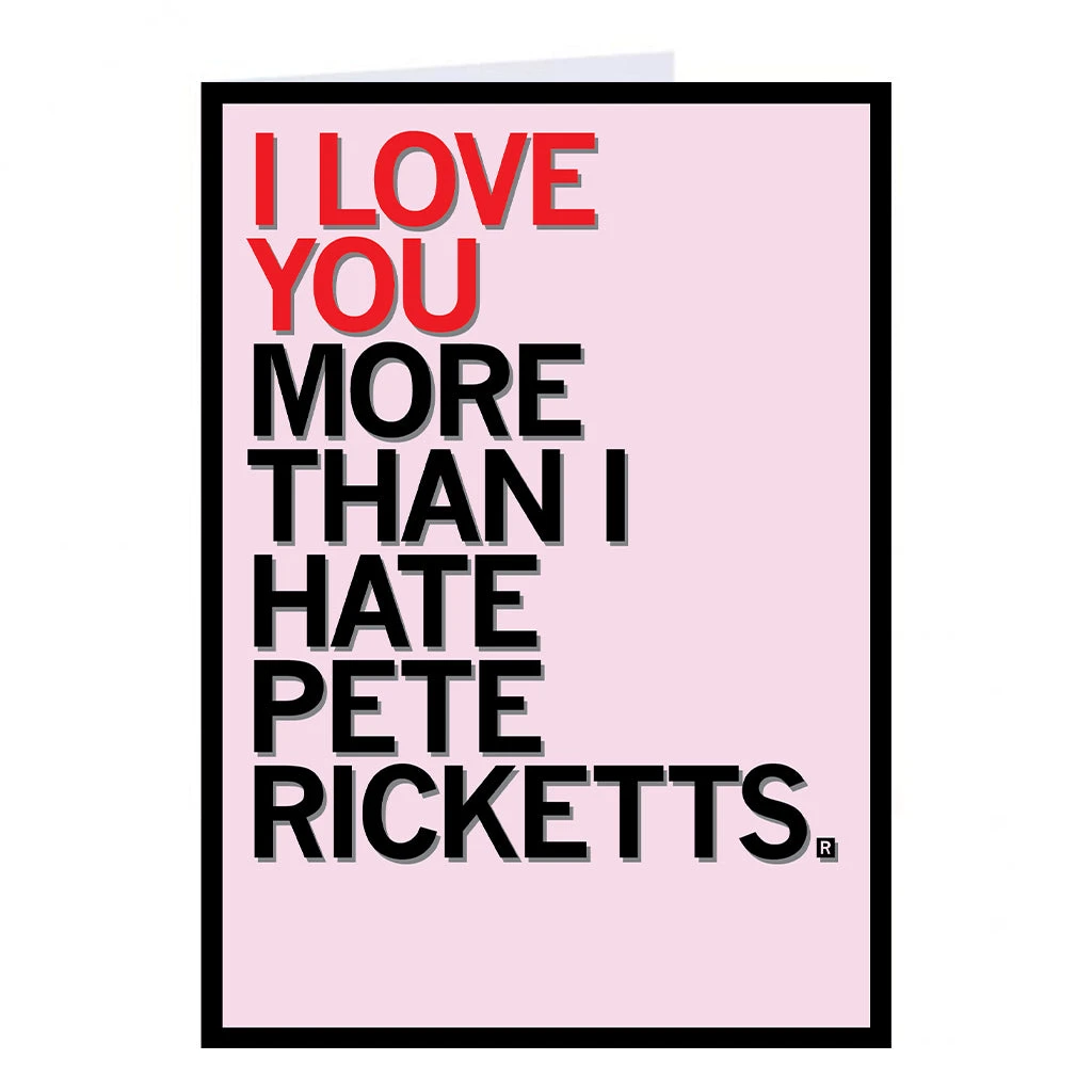 I Love You More Than I Hate Pete Ricketts. A Portion of All RAYGUN Sales Raise Money For Organizations That We Support. 5″ x 7″ Folded Greeting Card. Inside of the card is blank and envelope included. Designed by RAYGUN and printed by union labor at Garner Printing in Des Moines, IA.