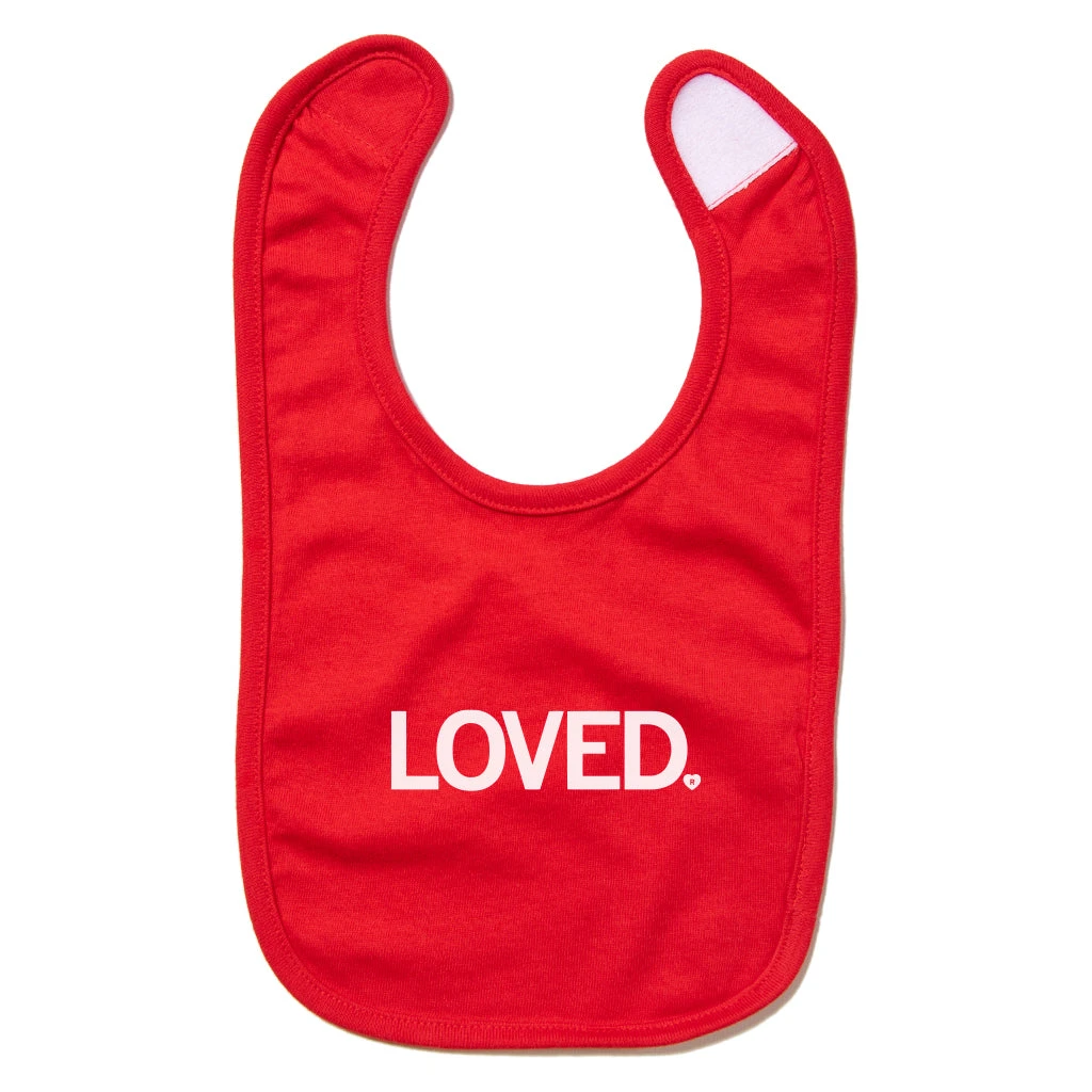Loved. A Portion of All RAYGUN Sales Raise Money For Organizations That We Support. White Screen Print on a Red bib (100% Baby Rib Cotton). Cut and sewn sweatshop free. Designed and printed by Union Labor at RAYGUN.