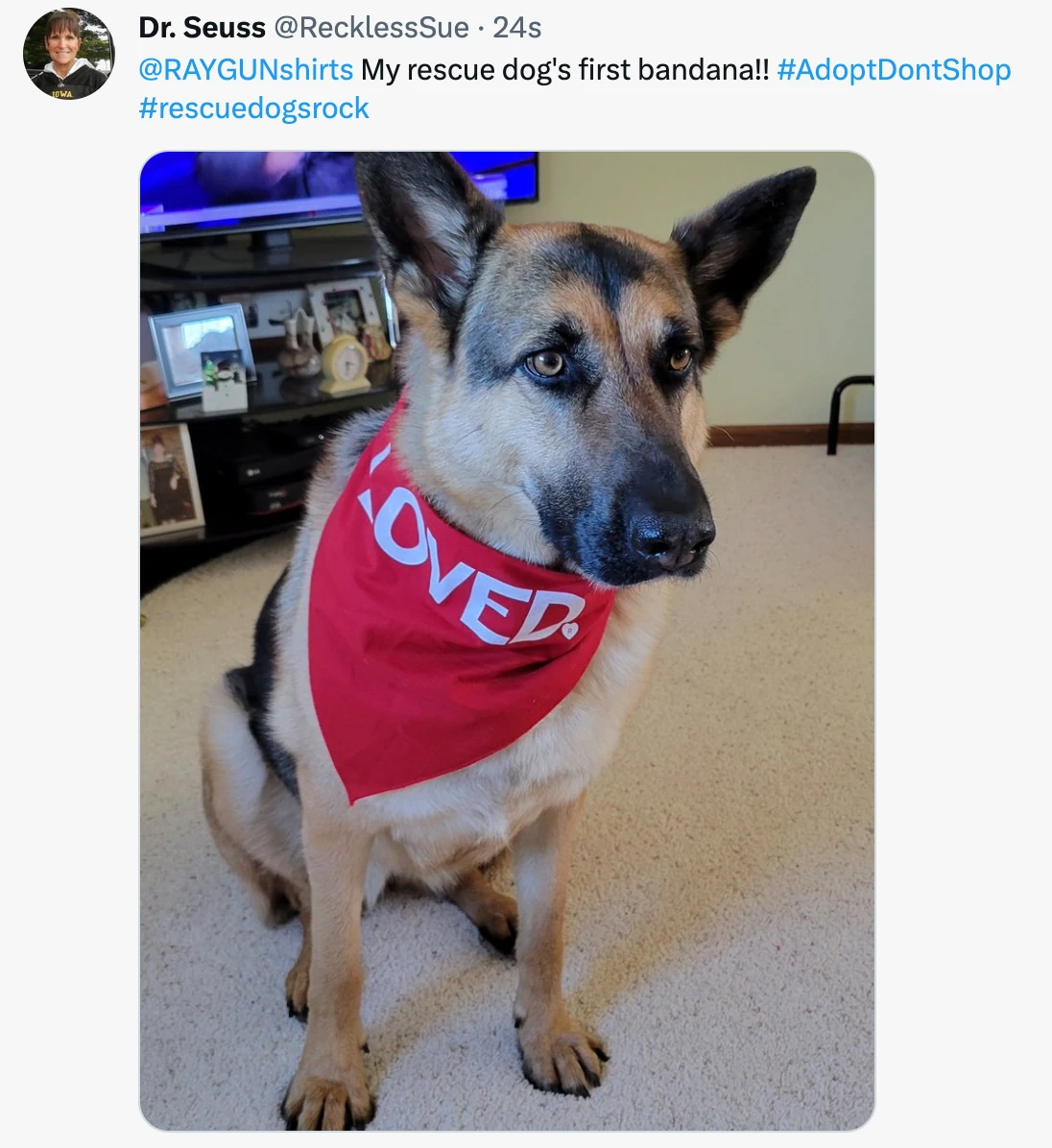 Loved. A Portion of All RAYGUN Sales Raise Money For Organizations That We Support. White Screen Print on a Red Dog Bandana (50% cotton / 50% polyester). 30″ wide x 15″ tall. Designed & screen printed by Union Labor at RAYGUN. Cut & sewn by Doggie Skins.