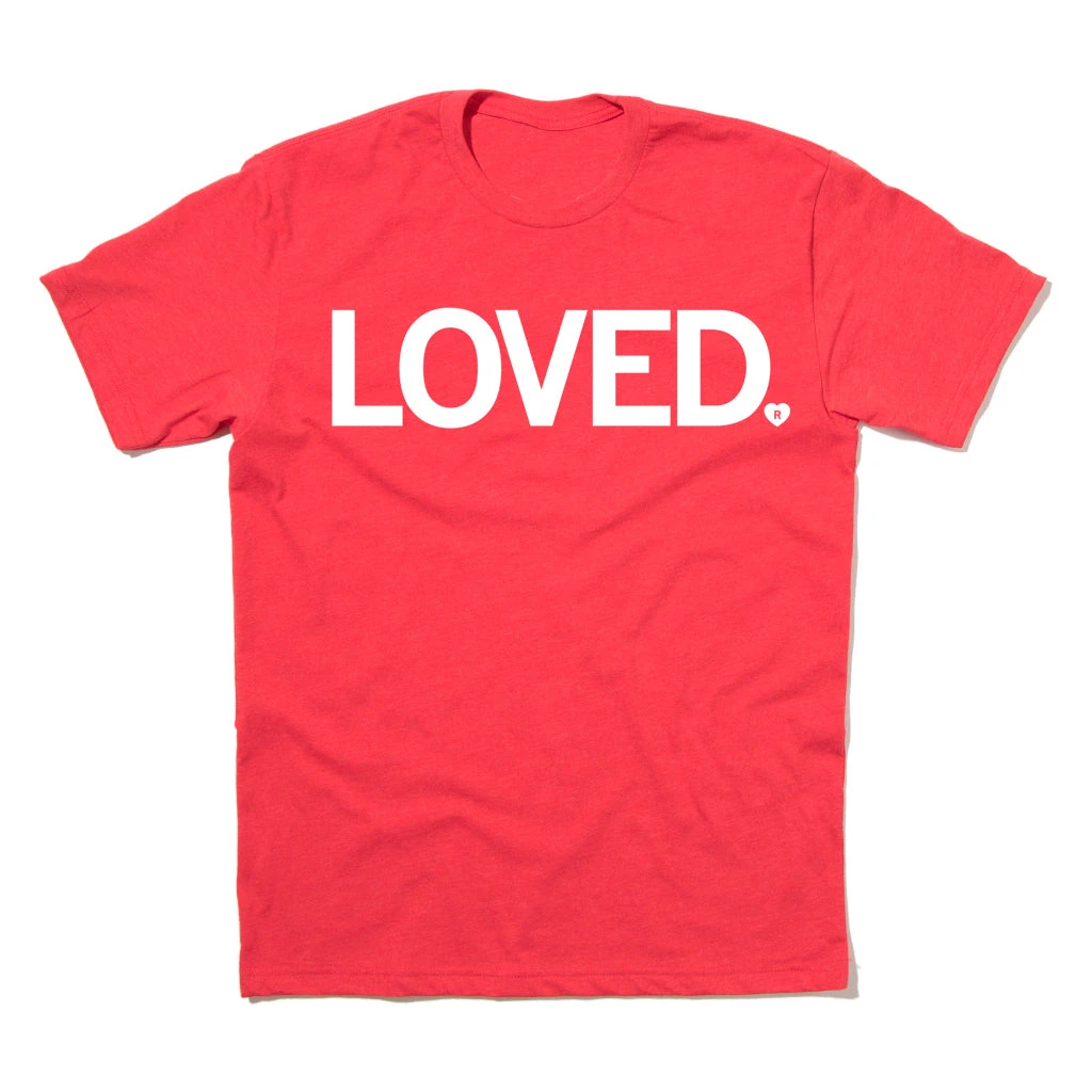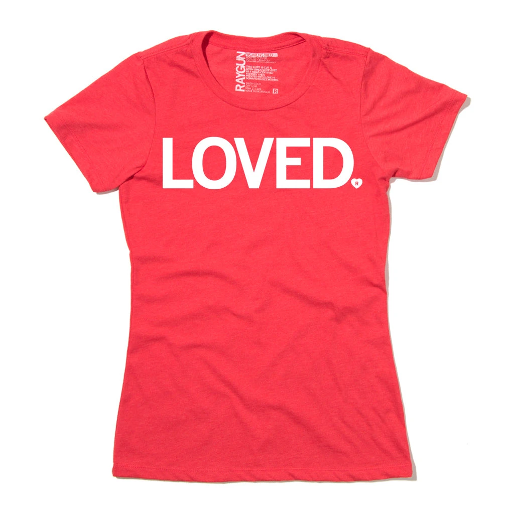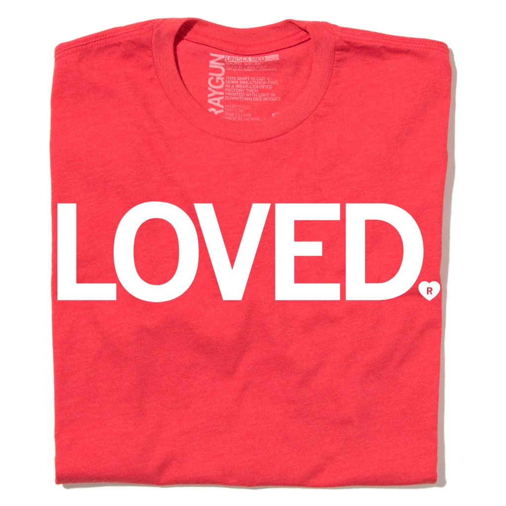 I’m Loved. A Portion of All Raygun Sales Raise Money For Organizations That We Support. White Screen Print on a Red T-Shirt (100% Combed Ring-spun Cotton). Cut and sewn sweatshop free. Designed and printed by Union Labor at RAYGUN.