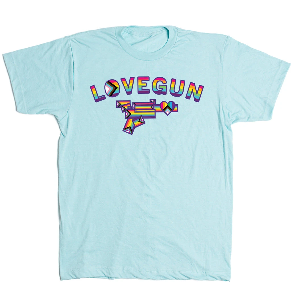 Lovegun. A Portion of All RAYGUN Sales Raise Money For Organizations That We Support. Heat Transfer on a Heather Purist Blue T-shirt (50% Polyester / 50% Combed Ringspun Cotton). Cut & sewn sweatshop free. Designed and Printed by Union Labor at RAYGUN.