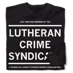 Just Another Member of the Lutheran Crime Syndicate, a Diabolical Group Strengthening Communities. A Portion of proceeds support Lutheran Social Services in Iowa. White Screen Print on a Black Crew Sweatshirt (75% Combed Ringspun Cotton / 25% Polyester). Cut & sewn sweatshop free. Designed and Printed by Union Labor at RAYGUN.