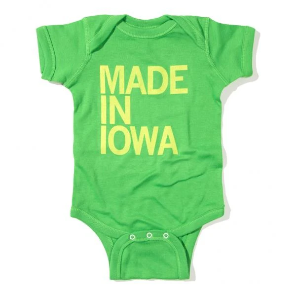 Made In Iowa. Yellow Screen Print on a Apple Onesie (100% Baby Rib Cotton). Item will shrink an average of one size when put in the dryer. Cut and sewn sweatshop free. Designed and printed by Union Labor at RAYGUN.