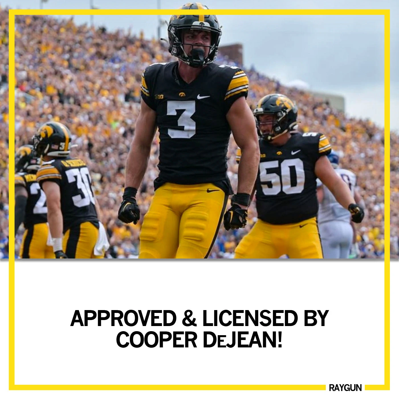 Cooper DeJean: Made in Odebolt. Officially licensed with Cooper DeJean. This shirt has been approved by Cooper DeJean. Gold Screen Print on a Charcoal T-shirt (50% Combed Ringspun Cotton 50% Polyester). Cut and sewn sweatshop free. Designed and printed by Union Labor at RAYGUN.