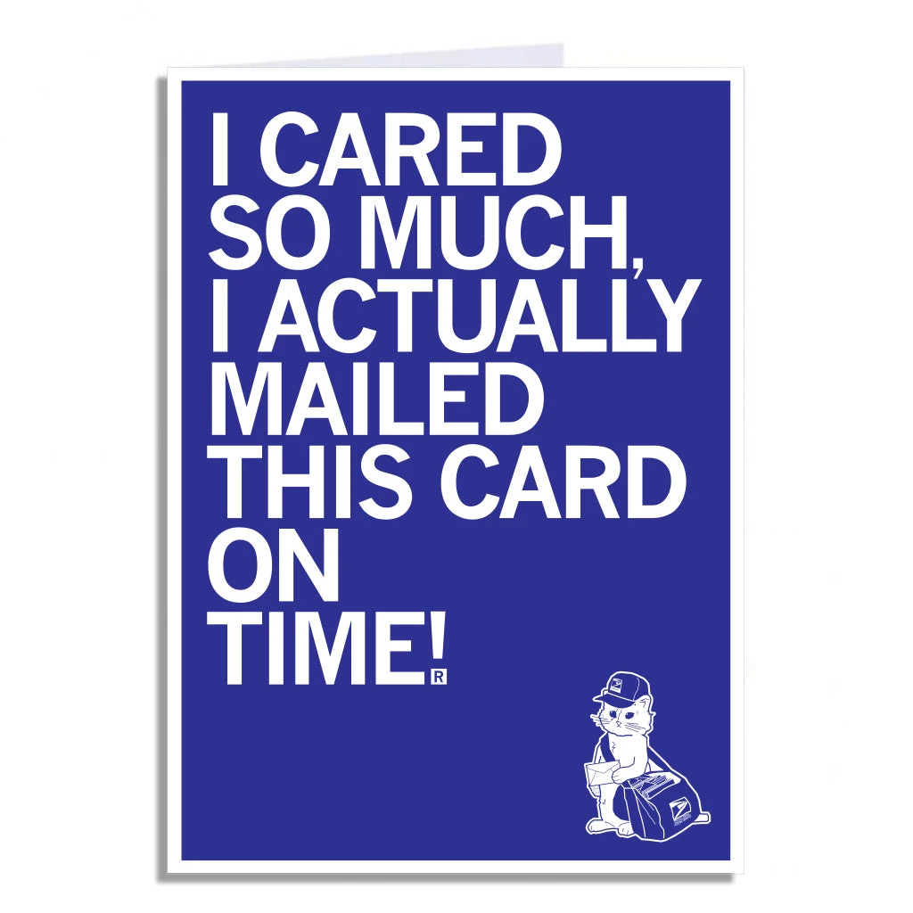 I cared so much I actually mailed this card on time. A Portion of All RAYGUN Sales Raise Money For Organizations That We Support. 5″ x 7″ Folded Greeting Card. Inside of the card is blank and envelope included. Designed by RAYGUN and printed by union labor at Garner Printing in Des Moines, IA.