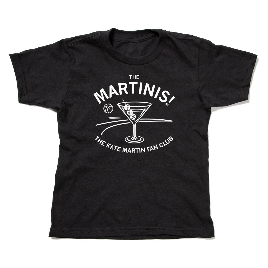 The Martinis! The Kate Martin Fan Club. White Screen Print on a Black T-Shirt (100% Combed Ringspun Cotton). Cut and sewn sweatshop free. Designed and printed by Union Labor at RAYGUN.