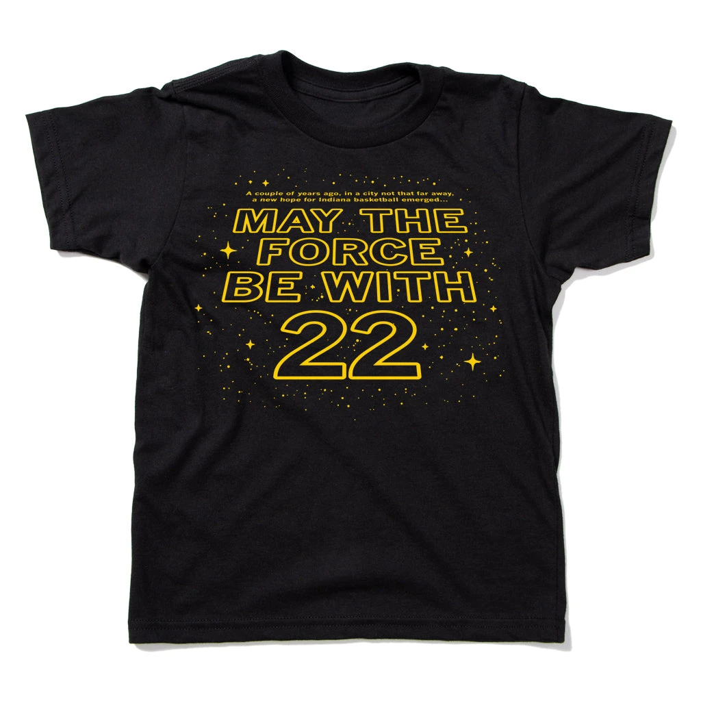 A couple of years ago, in a city not that far away, a new hope for Indiana basketball emerged…may the force be with 22. A Portion of All RAYGUN Sales Raise Money For Organizations That We Support. Gold Screen Print on a Black T-Shirt (100% Combed Ringspun Cotton). Cut and sewn sweatshop free. Designed and printed by Union Labor at RAYGUN.